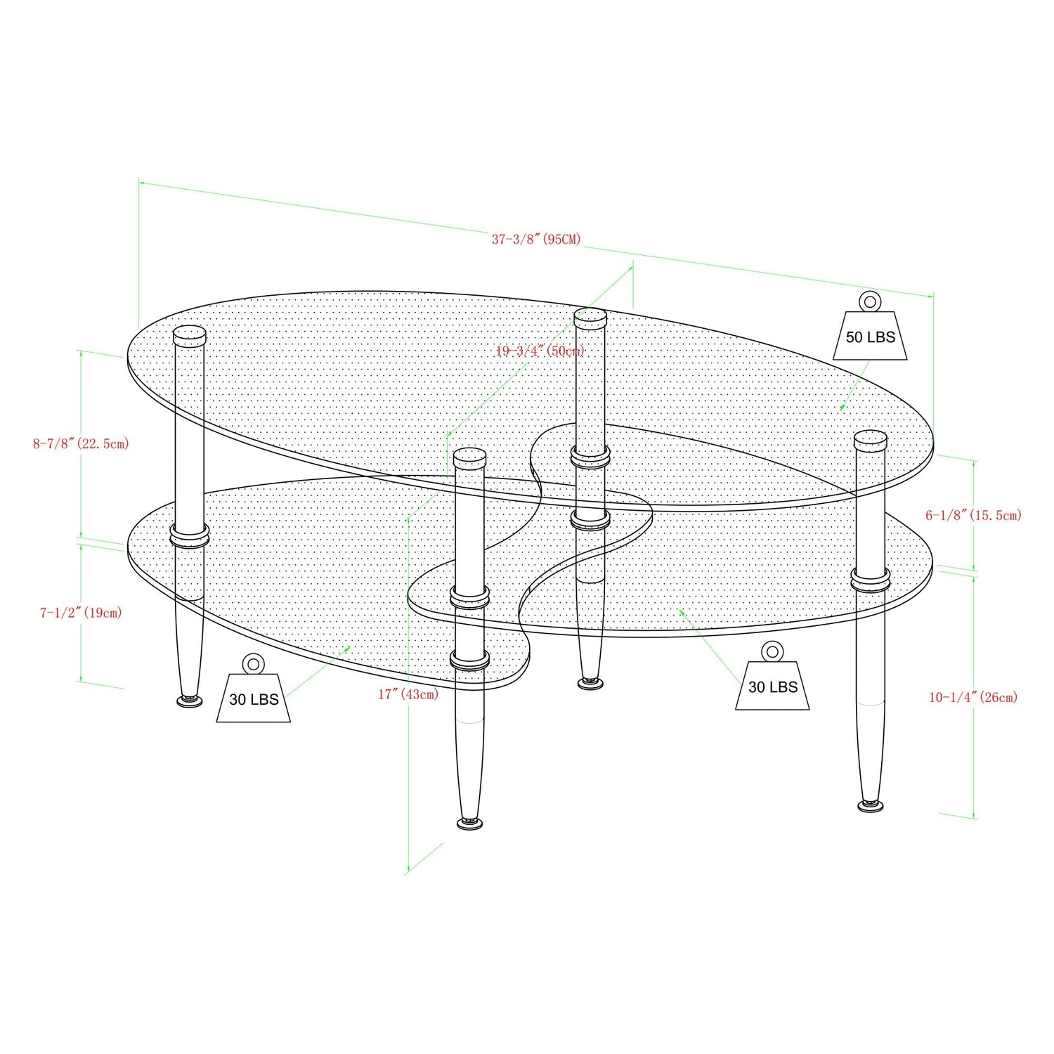 - Oval-shape with distinct tapered legs