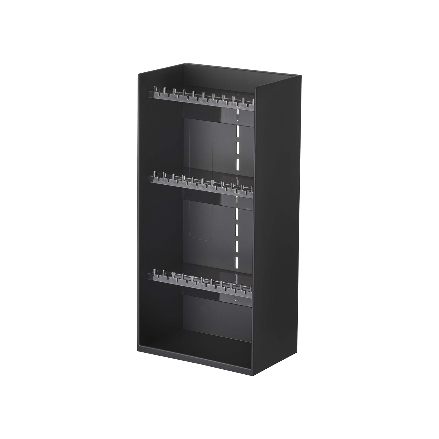 A wardrobe for your gems! Customize a happy display for your earrings, chains, or beauty products with this all-adjustable solution. The vertical design keeps things compact, while the many hooks and ridges provide ample and tangle-free hanging space for your favorite bits and baubles. Adjust shelf height with the many slots for bulkier accessories like frames or claw clips to make the most of your space.