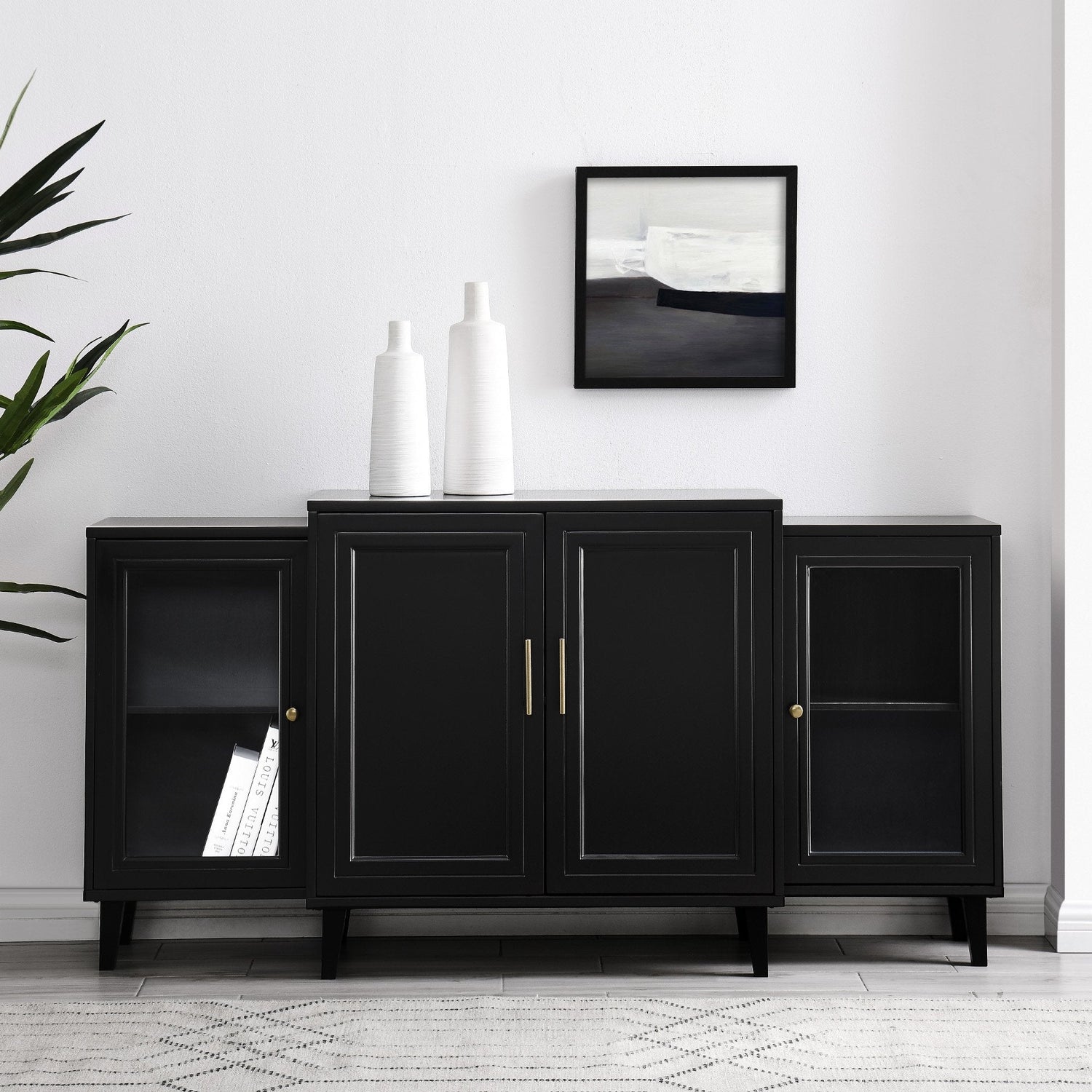 Feel fancy when you set up this contemporary 62” tiered buffet sideboard & tv stand in your home. Two tempered glass doors frame the side sections of this modern storage console, with two opaque wood doors in the middle. Every compartment has one adjustable shelf. This piece can be used in a dining room as a buffet or in a living room as an entertainment center. For your convenience this elegant sideboard includes cord management holes and can accommodate TVs up to 68 inches.