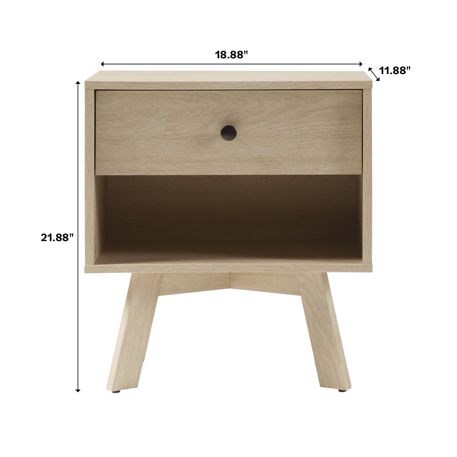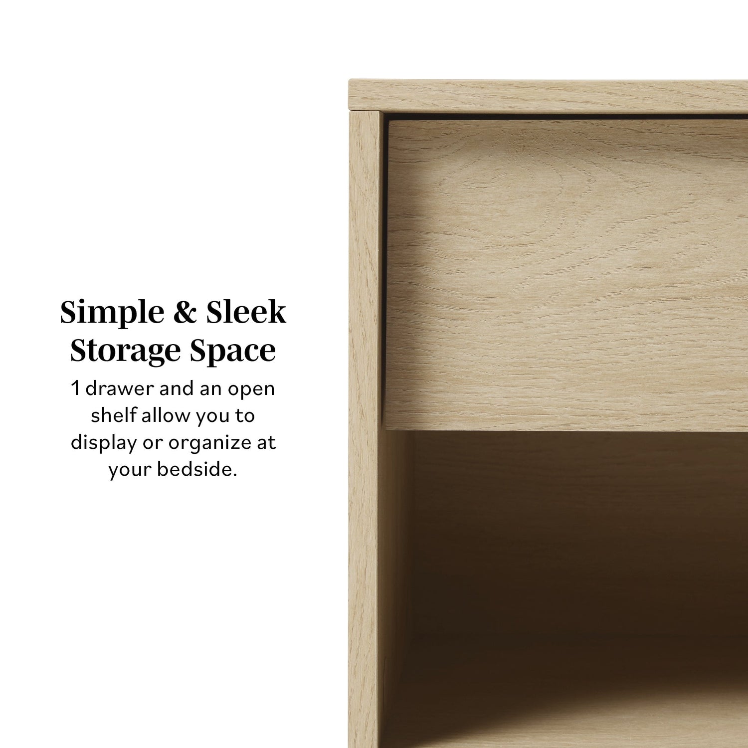 Simple yet ultra-sleek, this understated nightstand is as convenient as it is stylish. Whether it’s at your bedside or sitting by your couch, this side table is here to serve. Its single drawer on smooth glides slides out to store your skincare essentials or electronics, while the open cubby is there to help you display your favorite décor or current read. Minimalist hardware lends a modern feel to the mid-century silhouette of the piece. Perfect for your child’s room or your own sanctuary, this nightstand is just the piece you’ve been looking for.