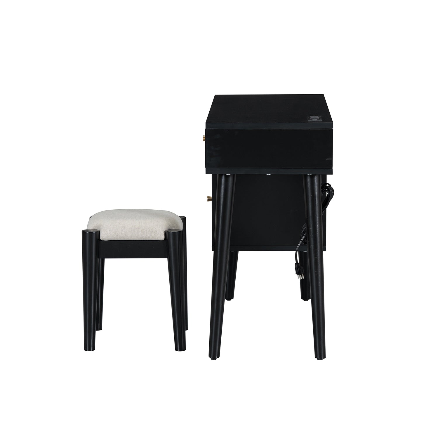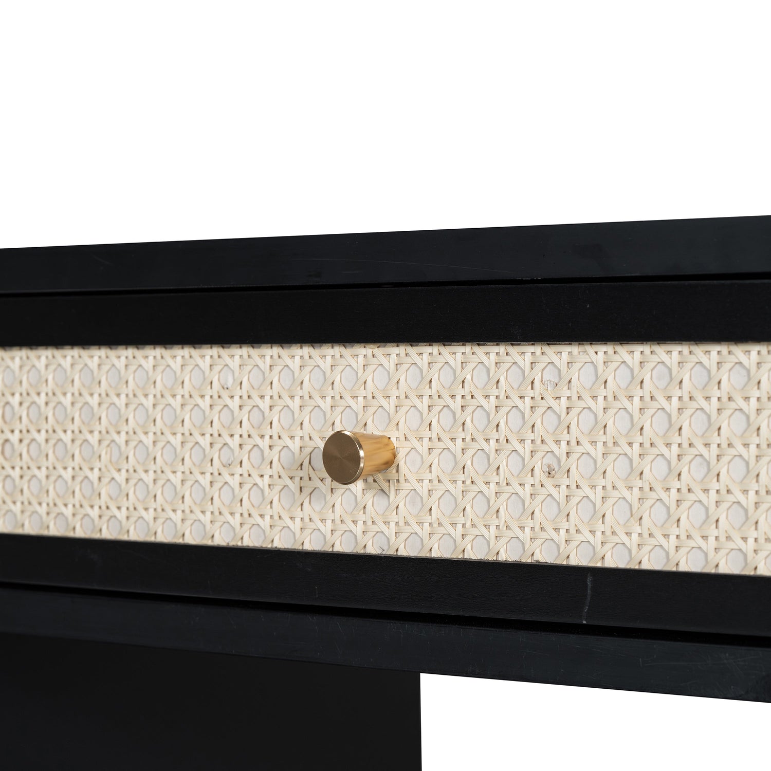 This dressing table is retro and modern in design. It uses rattan to decorate the drawers, creating a simple and elegant atmosphere. The tabletop has a charging plug and USB port for connecting the mirror with light and charging the mobile phone, tablet fill light, etc. It is very practical! There are 3 large storage drawers on the left side of the table, which are also suitable for placing cosmetics, hair dryers, curling irons, books, clothes, etc. The stool is covered with cushions, and it will feel very comfortable to sit on it. In short, this set is very suitable for your bedroom.  Mirror not included.