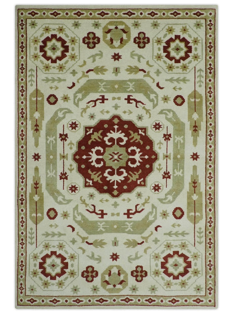 Light Green, Ivory and Maroon Traditional Hand knotted Custom Made wool Area Rug