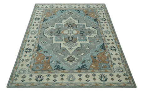 Custom Made Hand Knotted Silver, Teal, Ivory and Brown Traditional Oriental Oushak wool area Rug