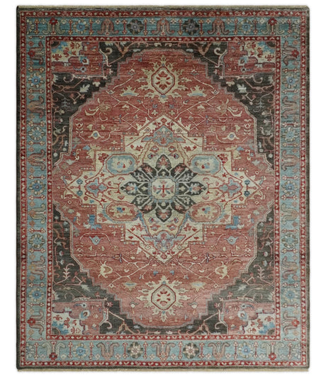 Custom Made Traditional Heriz Rust, Ivory, Black and Beige Hand knotted Medallion Wool Area Rug