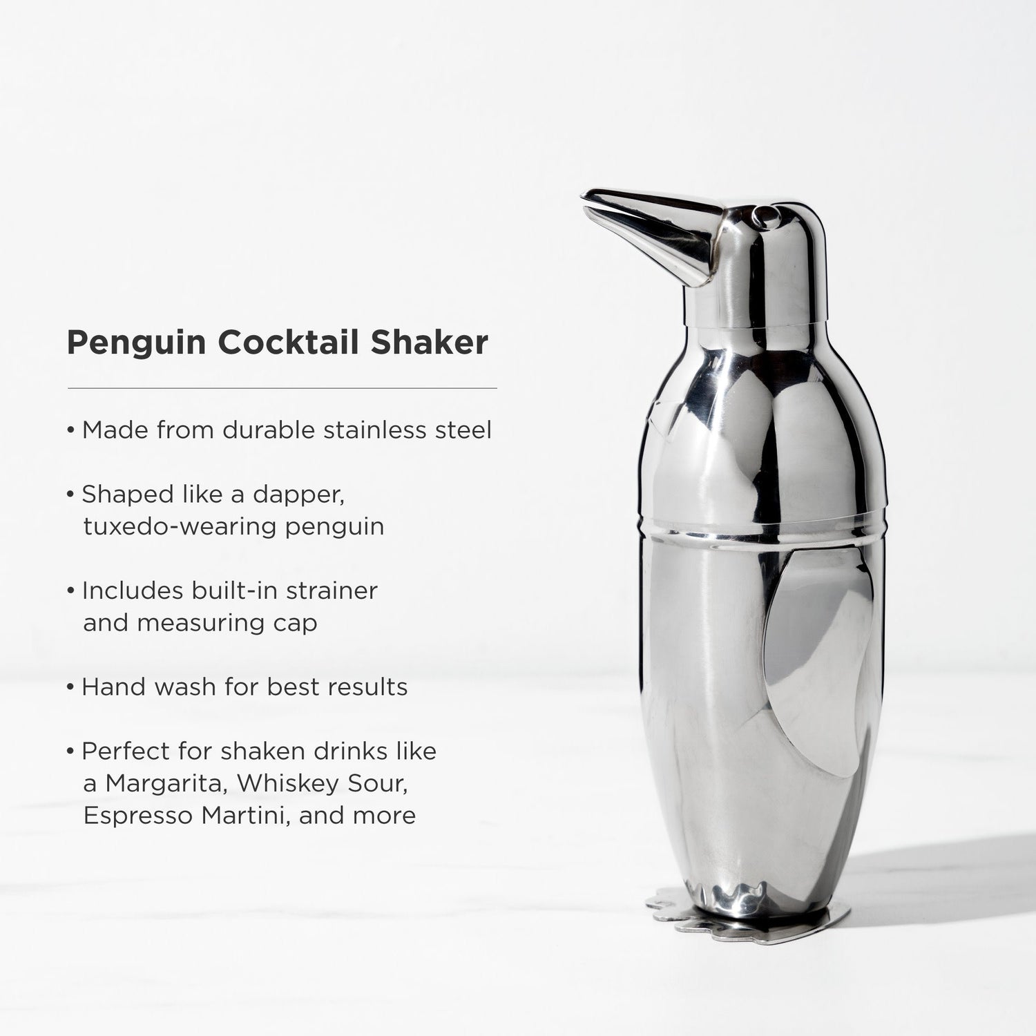 Bow-tied, tuxedo-ed and stately in stainless steel, the Emperor penguin cocktail shaker stands tall amongst standard mixology tools to set your bar collection apart. The vessel holds 17 ounces and incorporates a built-in strainer. Dishwasher Safe.