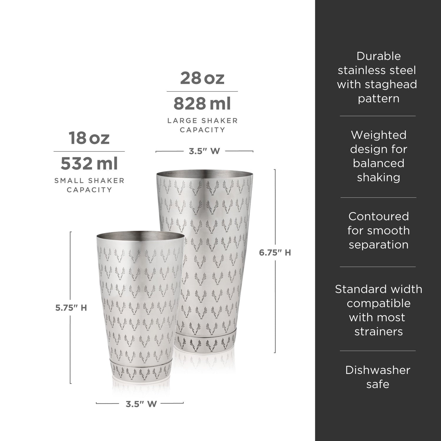 Beloved by bartenders and known for supreme functionality, Boston shakers are precisely weighted for perfect balance. This set is designed to close and separate smoothly and features a unique detail—a repeating staghead etched into the stainless steel.