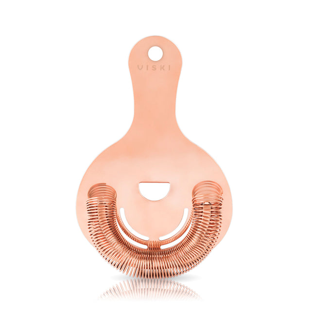An unobtrusive flat handle, broad face and tightly coiled spring define our professional-grade copper Hawthorne strainer, while two symmetrical sets of perforations provide the bonus of making split pours second nature.