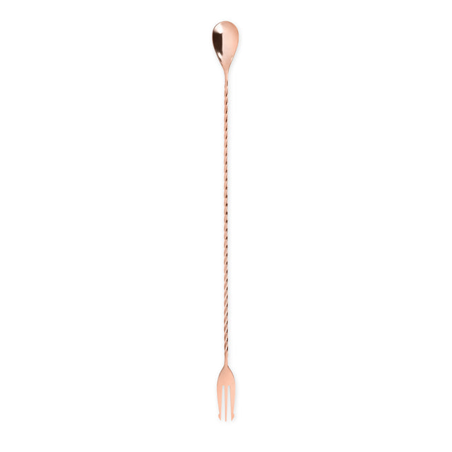 Designed for swizzling and stirring, our copper trident bar spoon sports a smooth spoon bowl and a forked tip at the stem's far end. A nod to the nautical, the trident also works for spearing the perfect garnish to cap your drink.