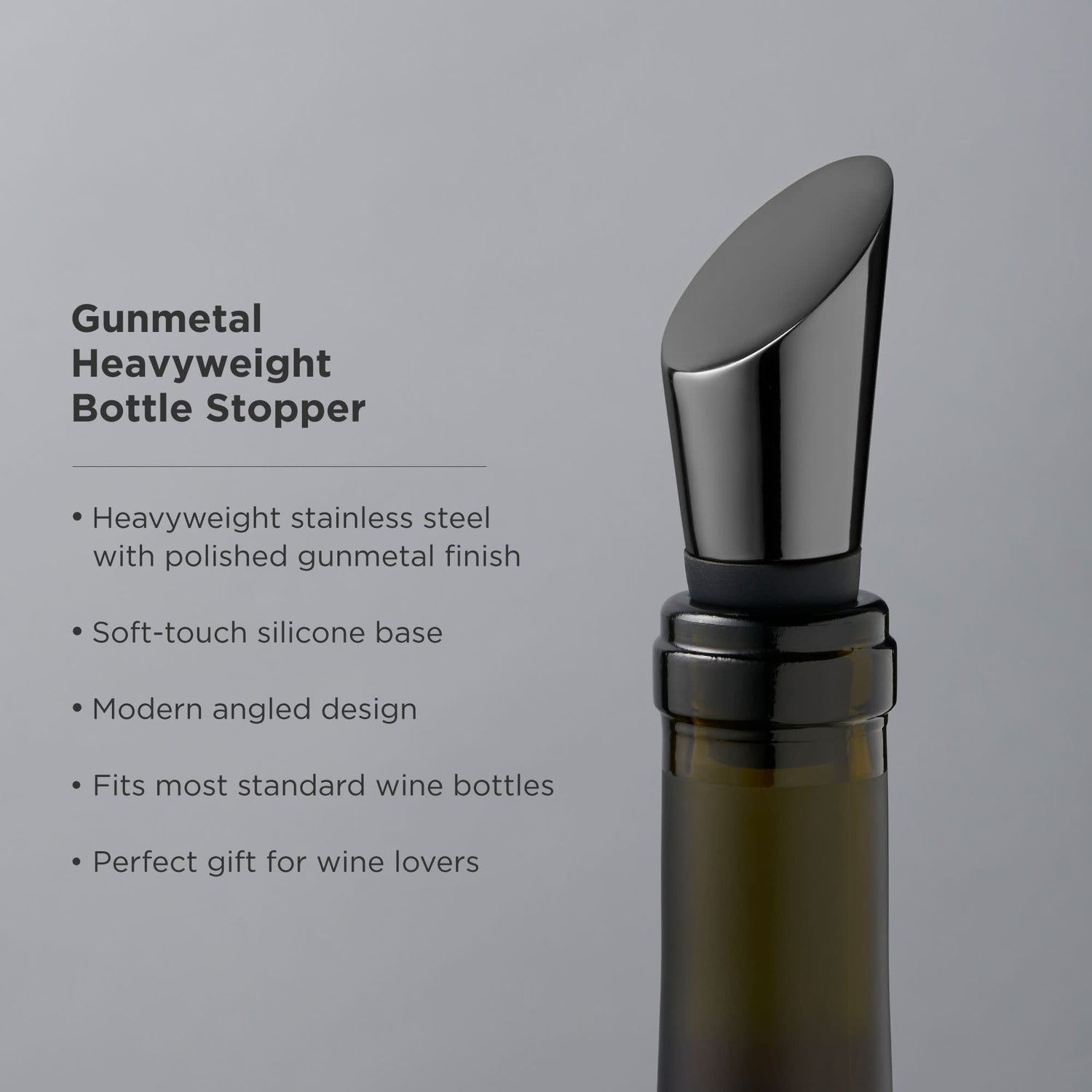 Eye-catching gunmetal black with a smooth silicone sleeve puts our heavyweight bottle stopper in center stage. Seemingly austere in shape, the slanted crown and burnished metal suggest an opulence that transcends the average tavern contrivance.