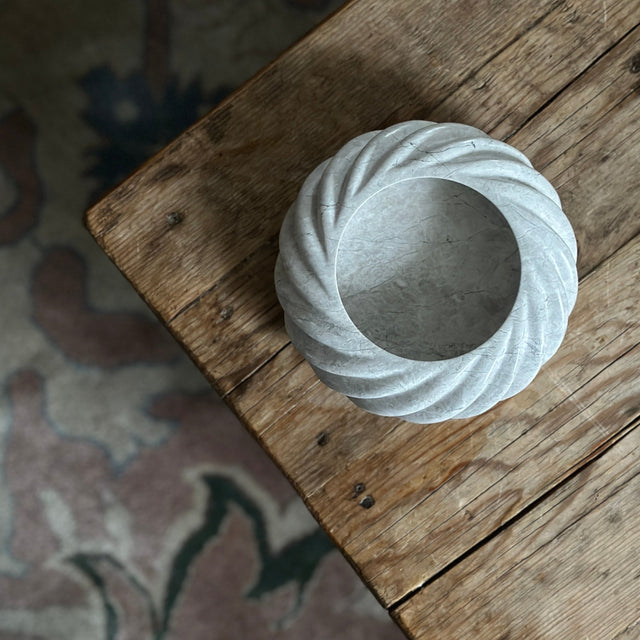 Carved from a single block of stone, its ridged edges spiral around a deep basin, catching light and shadow in motion. At 6″ across, it’s sized for nuts and olives at the table, jewelry by the bedside, or simply to rest as a sculptural accent on its own.