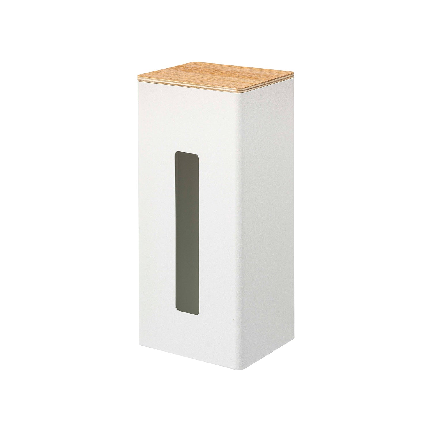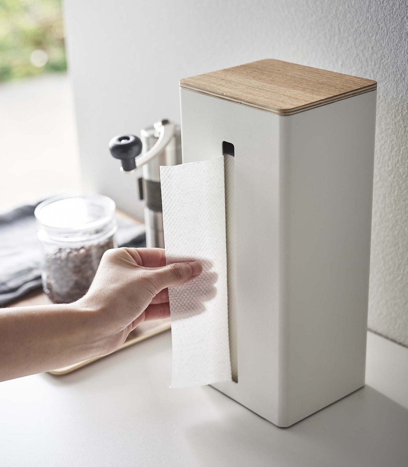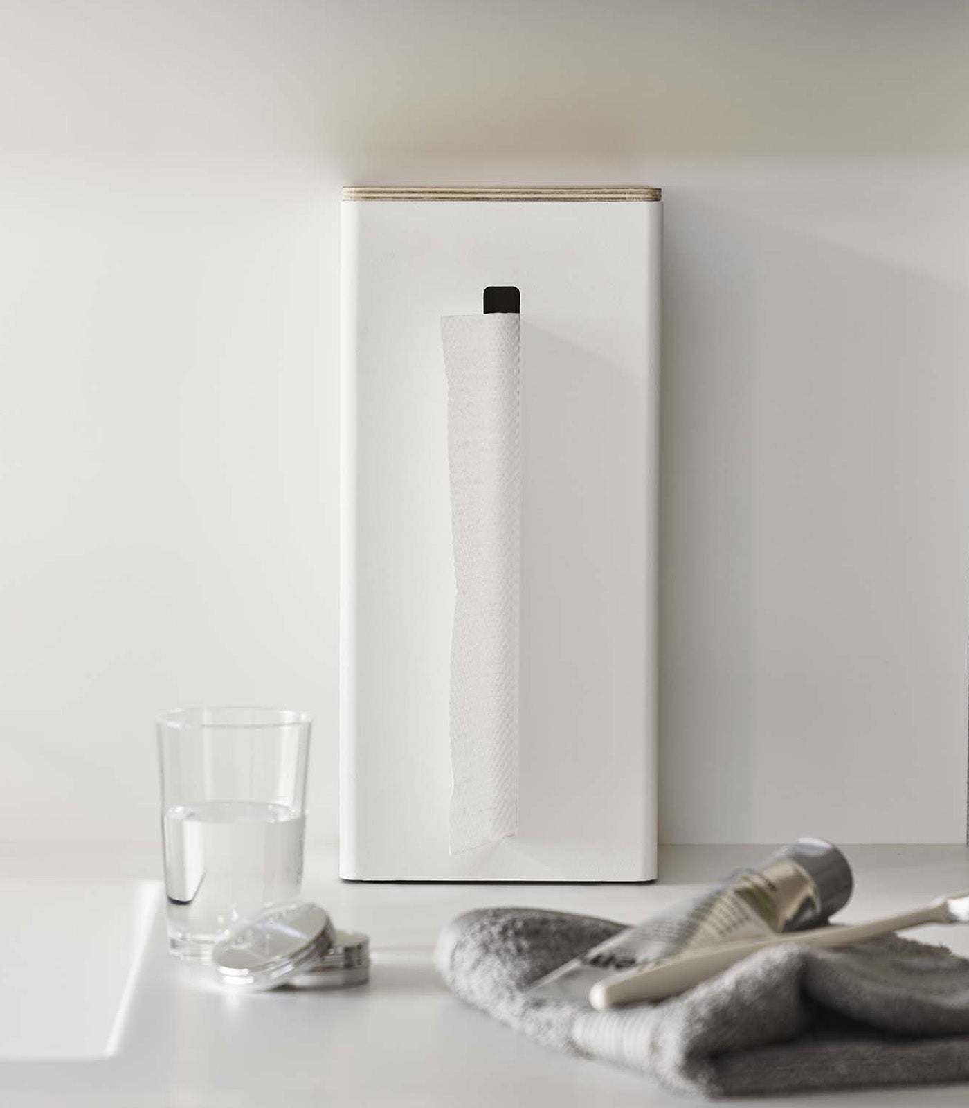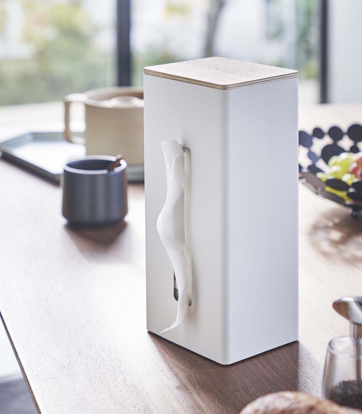Tissues at the double! Finally, a display-worthy solution that keeps faces and hands clean! This double-ended dispenser provides swift access to tissues, paper towels, or better yet, both. The chic, upright design conceals any eyesore packaging while saving space. Keep the different papers separate with the magnetic divider, or move it to the edge to accommodate standard tissue boxes. A stylish and functional boost for the dining table, countertop, or vanity.