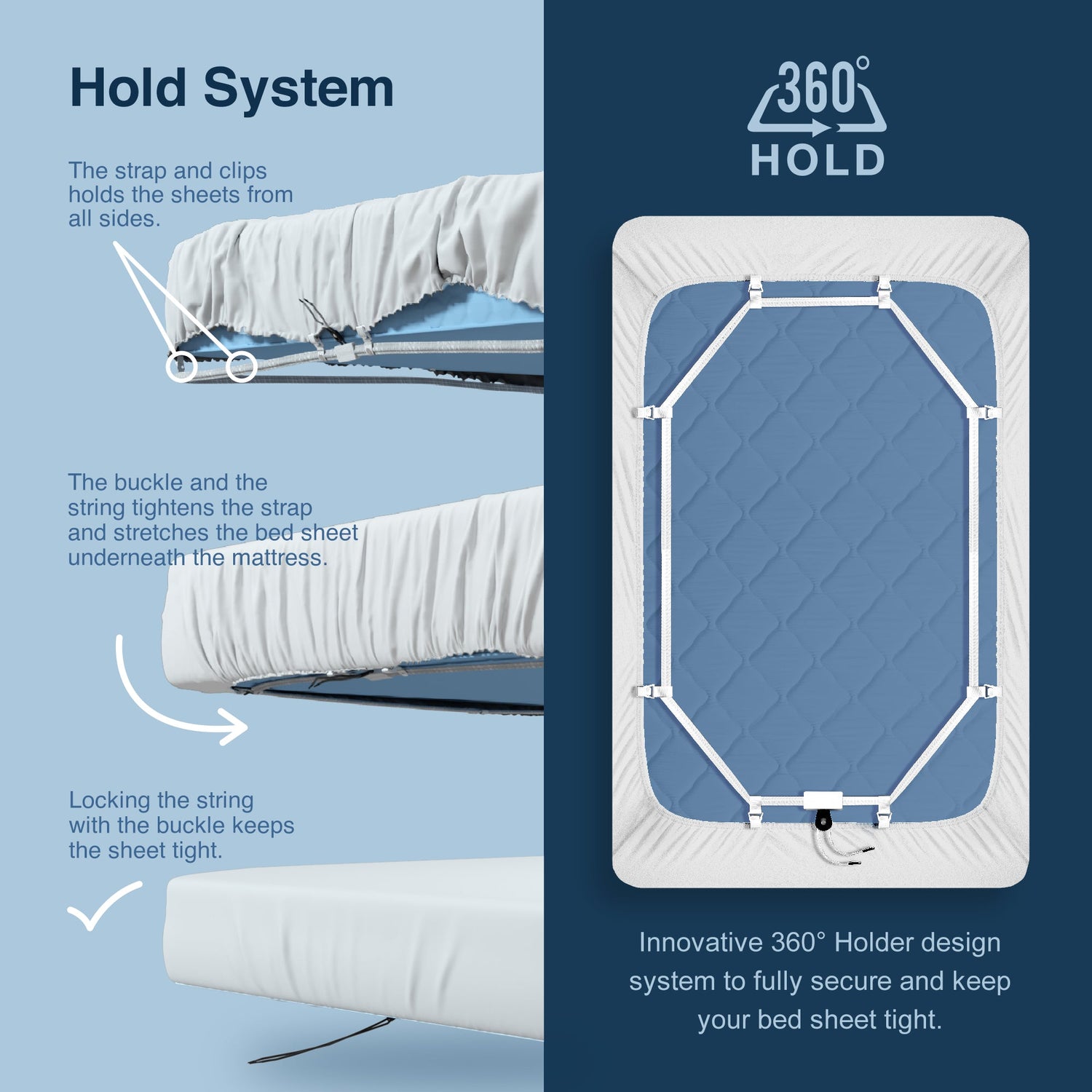 • Tightener & Holder for loose bed sheets and mattress toppers.