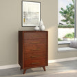 The streamlined design of the Arden mid-century 5 drawer chest creates a stunning focal point in your space. The clean lines, and angled legs combine to form a signature look to this classic piece. The Arden collection pieces are structurally sound and constructed with Mahogany wood solids & veneer in a classic Walnut (Brown) finish. The Arden collection hints at subtle refinement, without overpowering your current decor. Drawers feature English Dovetail Drawer Construction, felt lined top drawer to protect your valuables as well as metal ball bearing drawer glides  The pieces in the Alpine Furniture Arden collection fluidly fits in with a variety of aesthetics and color schemes to compliment your bedroom setting.  Coordinate with other pieces from the Arden bedroom collection.