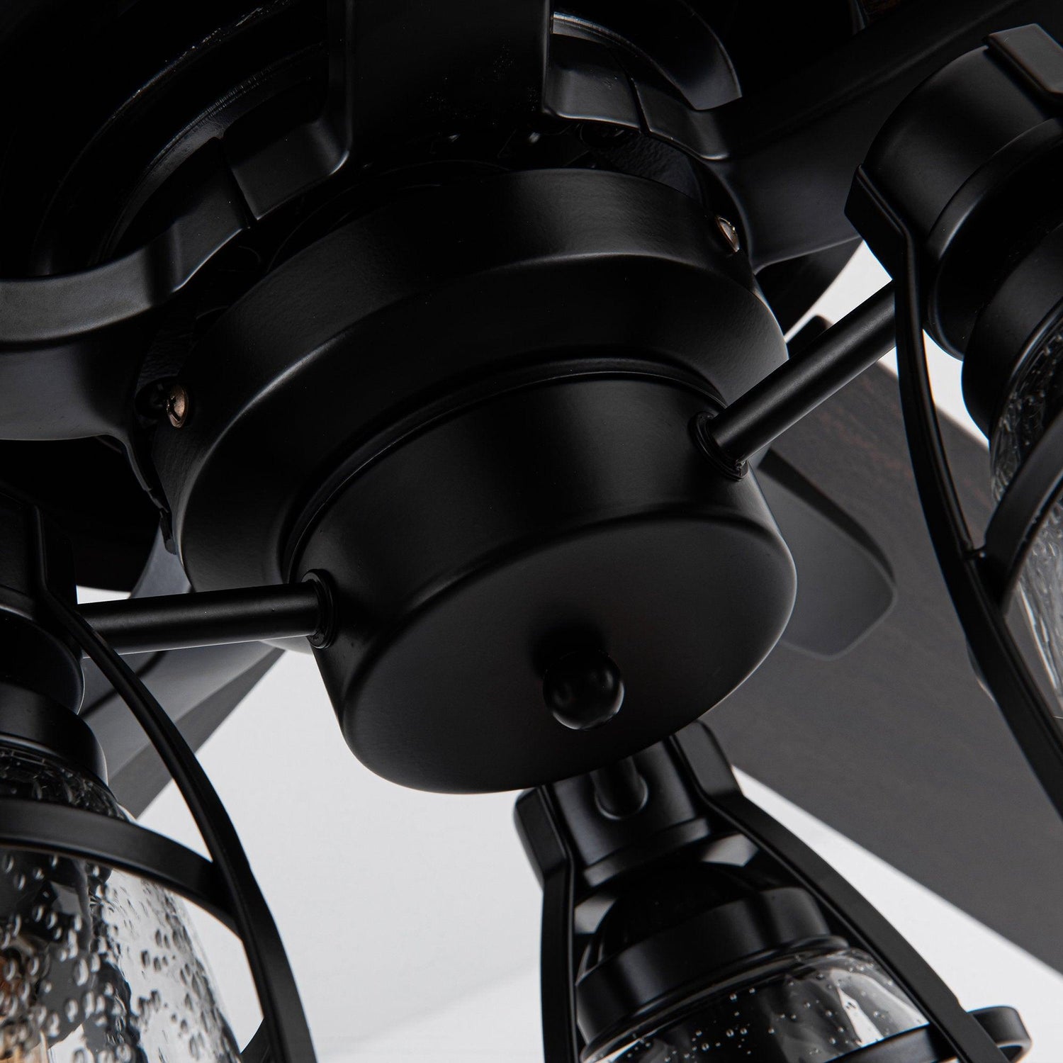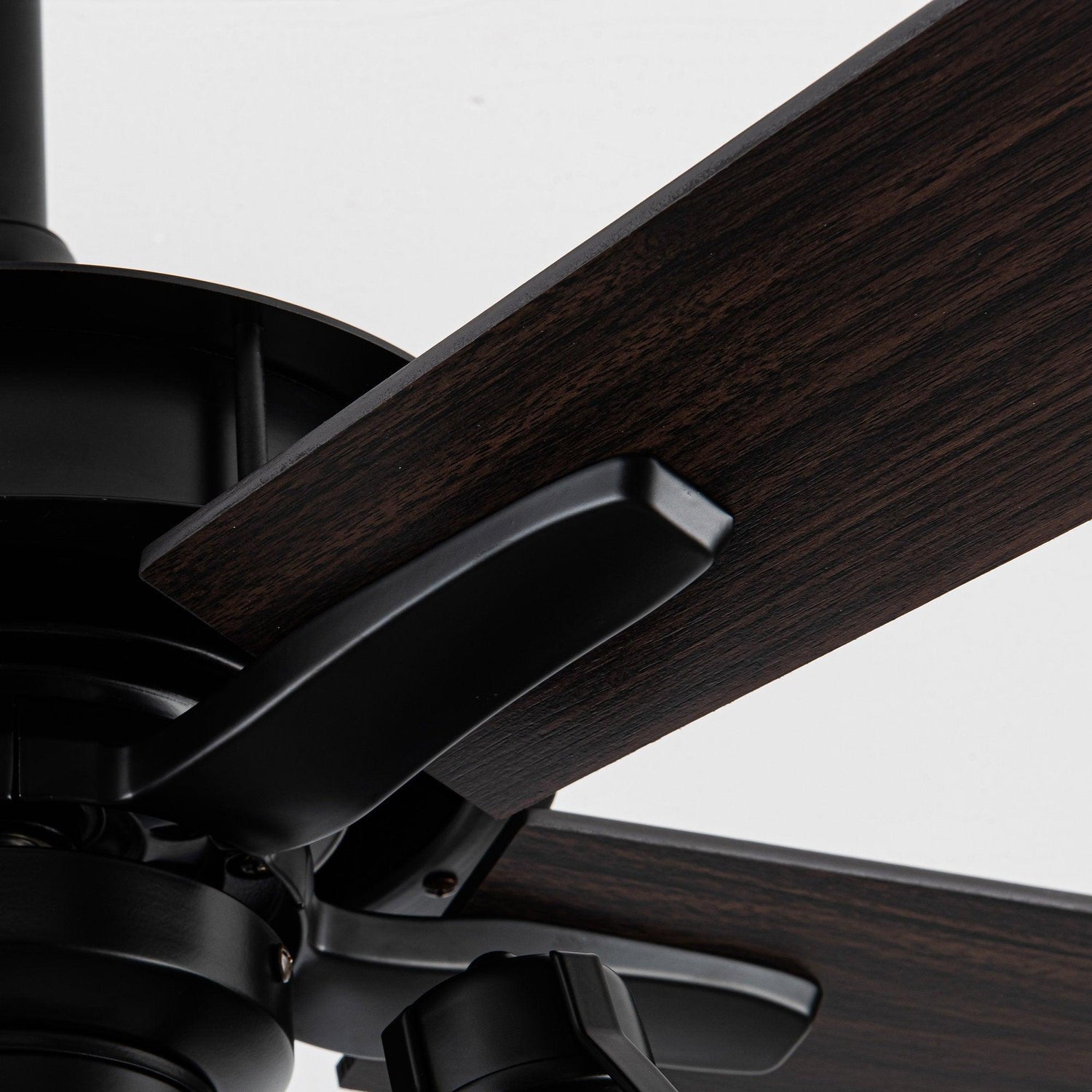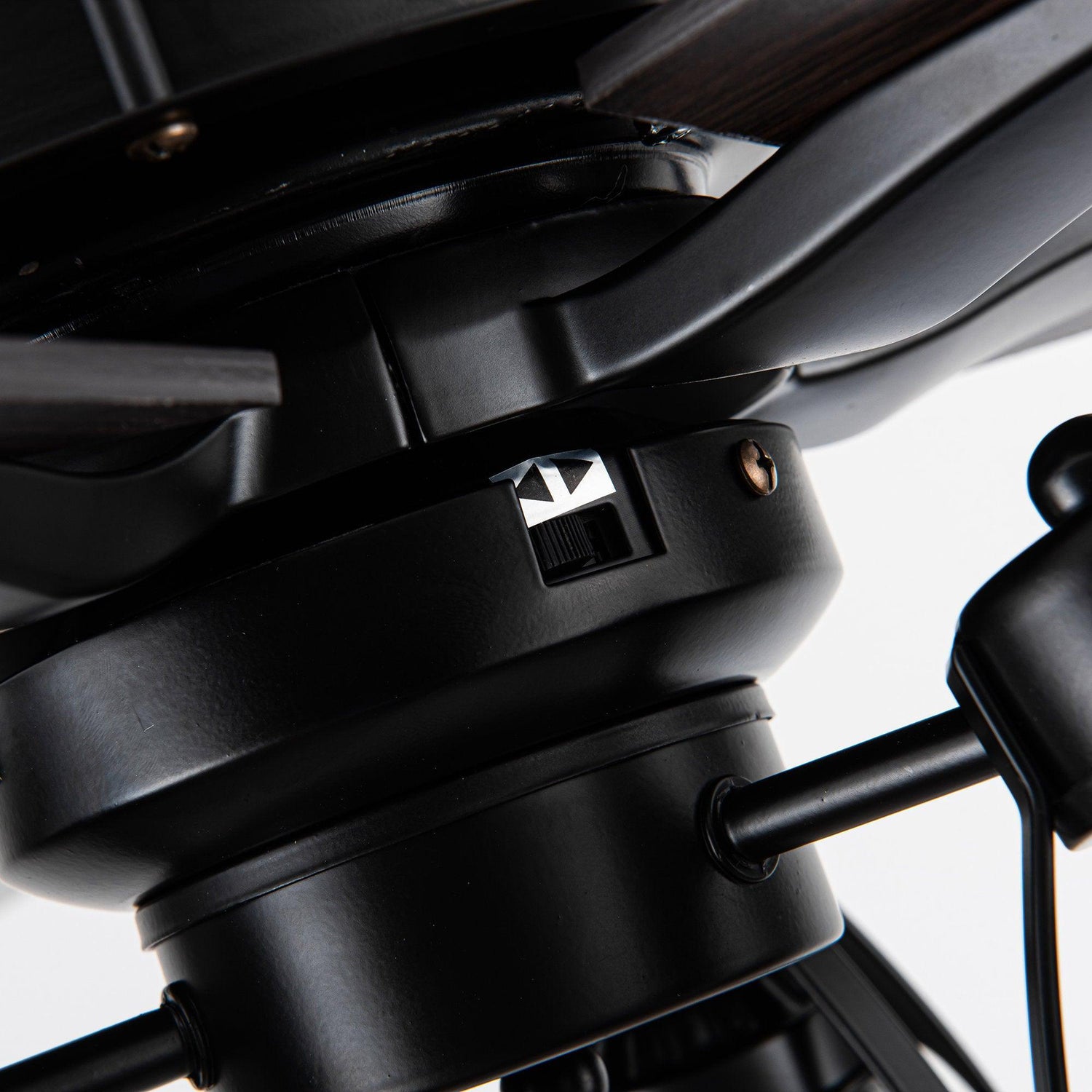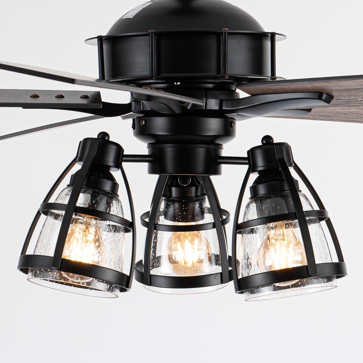 Enhance your indoor living space with this Kashmir 52-inch Industrial Style Black Ceiling Fan with a Light Kit and Remote Control. Ideal for indoor locations such as living rooms and bedrooms, this fan comes with a minimalist-style light kit that uses three 25-watt bulbs (not included). The powerful yet quiet 3-speed reversible motor is easily controlled with the included remote. Installation is a breeze with the included 5 blades. The matte black finish is complemented by 5 dark/light woodgrain finish reversible blades.
