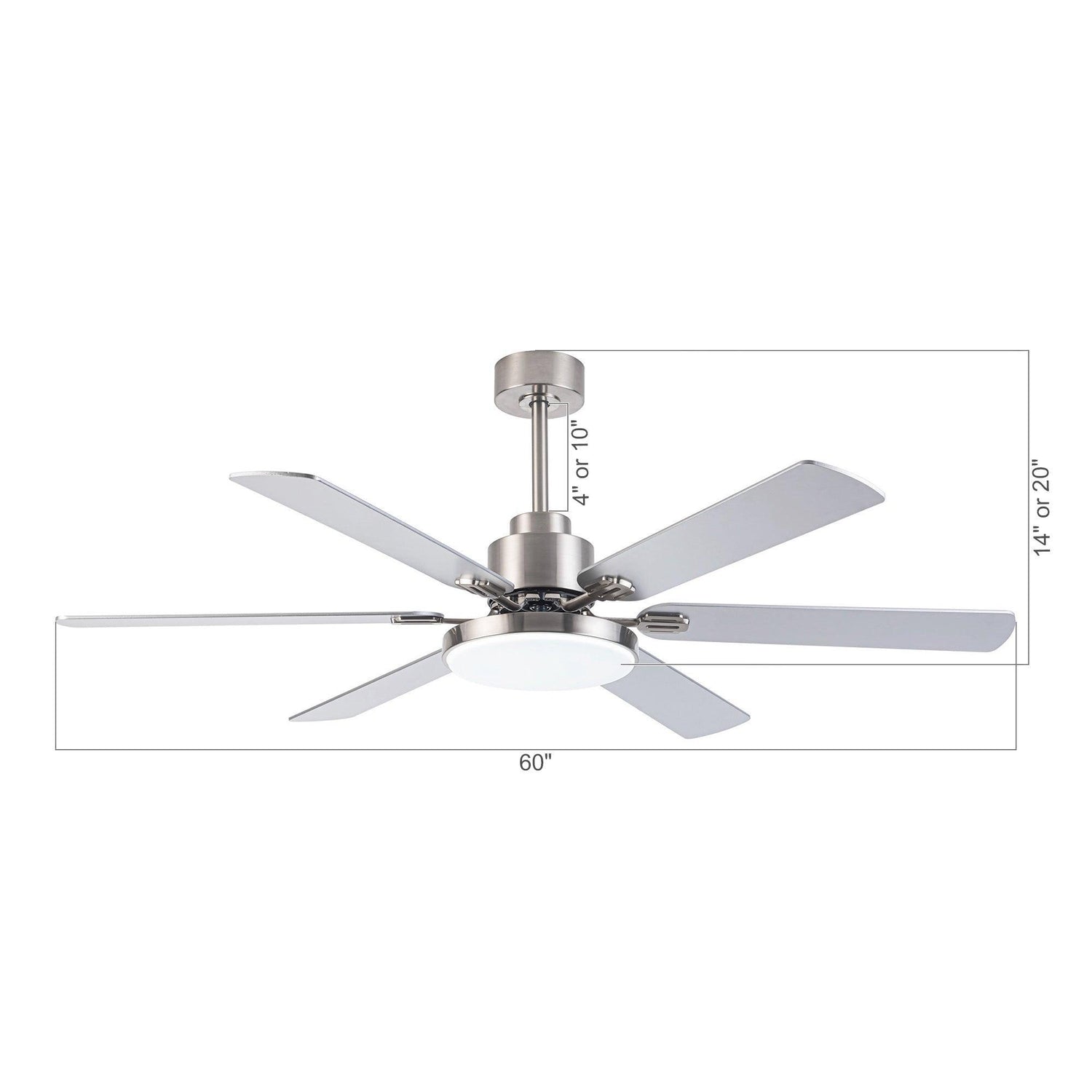Enjoy a refreshing breeze with this 60" ceiling fan. The contemporary styling and brushed nickel steel finish incorporate well into many decors, and its high-efficiency blade pitch allows greater air movement. This single-mount fan includes a 4-in and10-in down rod for added convenience and ease of installation. Featured 6 fan blades. Use included handheld remote control to easily change the speed of the reversible.