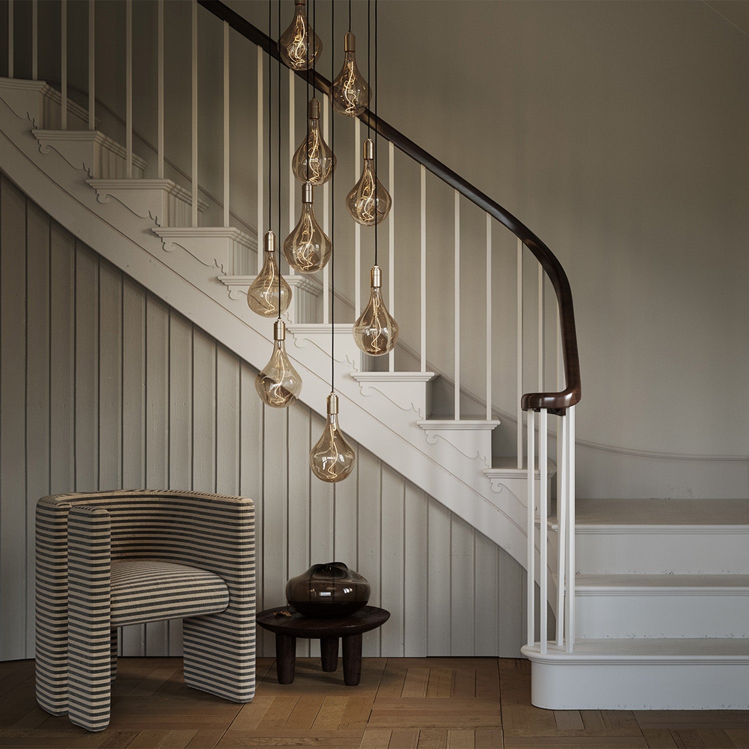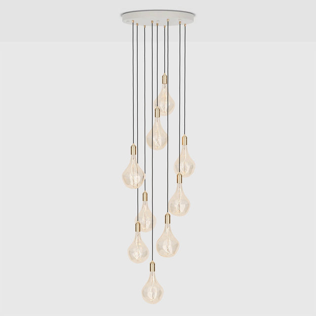 This statement light fixture from Tala combines nine signature pendants with nine distinctive, sculptural Voronoi II bulbs, all housed in a large ceiling canopy.