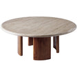 - Material: Top: Travertine; Base: Acacia, Manufactured Wood