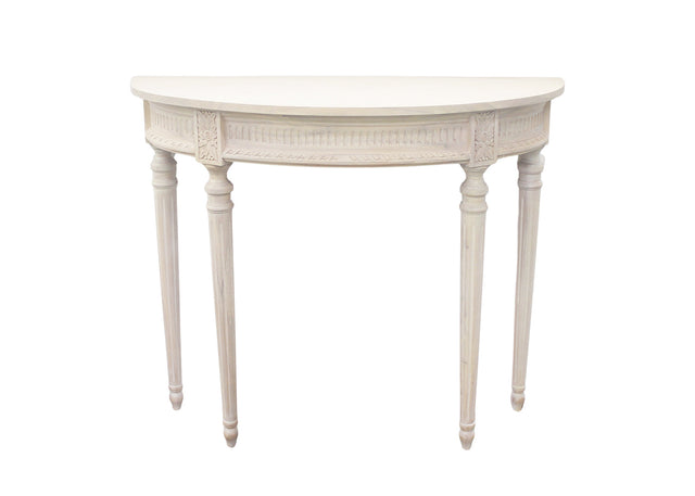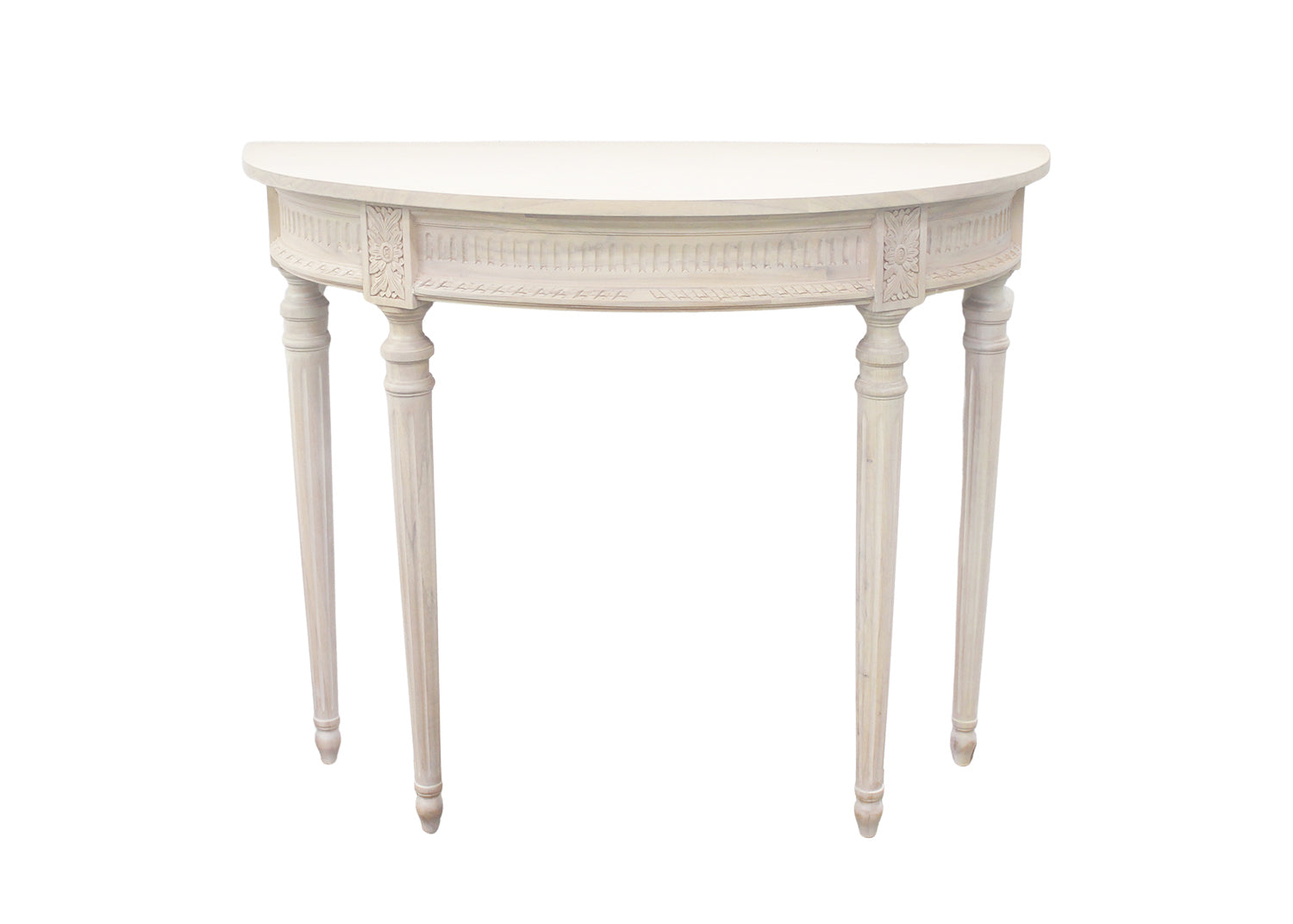 A fresh take on one of our best-selling designs, the Camille Demilune in a white washed finish brings a soft, tonal look to this timeless silhouette. Inspired by neoclassical design, it features delicately hand-carved floral motifs and fluted legs that offer a refined, graceful presence.