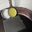 Fine-mesh stainless steel chainmail scrubber with silicone insert. Designed for carbon steel and cast iron cookware, the durable stainless steel mesh effectively removes stubborn residues and burned on food without ruining your seasoning. If it comes off with the chainmail, it is meant to come off!