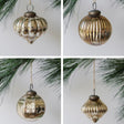 Our Set of 4 Handcrafted Mouthblown Glass Ornaments in a timeless antique gold finish with four unique shapes, each adorned with a bronze antique topper and natural jute hanger, these 3-inch ornaments with assorted shapes add a touch of timeless charm to your festivities. Imported to bring joy to your holiday season.