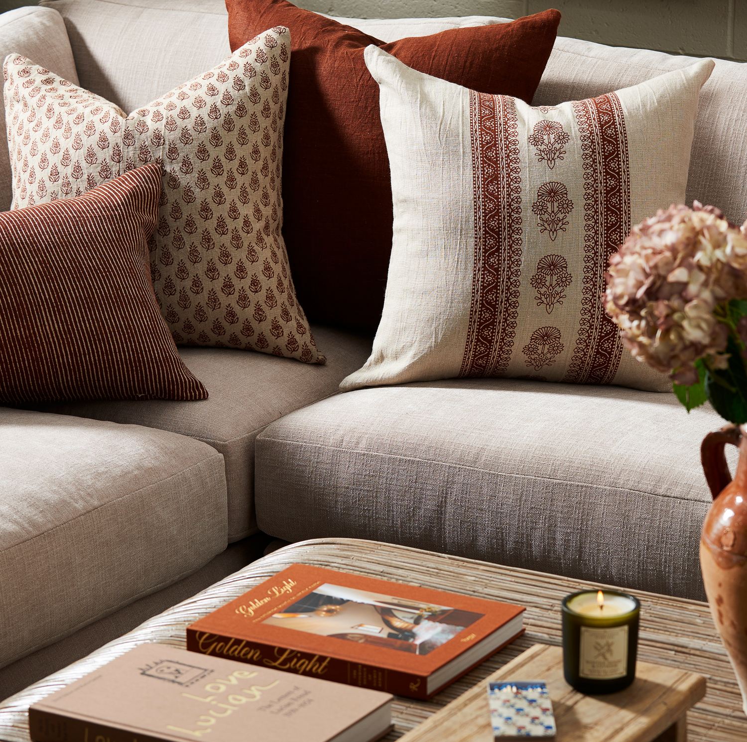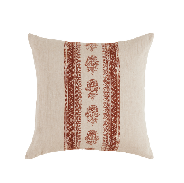The Chandra Pillow is a decorative throw pillow that features a bandana-inspired motif on both front and back. Crafted of 100% linen, the Chandra's warm tones make it the ideal pillow to mix, match, and layer on your sofa or bed. The neutral linen background color and red motif pattern provide a laid-back, global-inspired aesthetic, making it the perfect pillow for layering. Each pillowcase is handprinted by skilled artisans in India using a traditional wood block technique—designs are carved into individual blocks and hand-pressed to create a layered and detailed motif. Because each pillow is hand printed, expect natural variations in color and motif placement. Luxury Down or EcoSmart insert included.