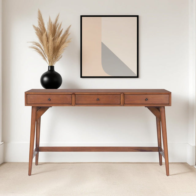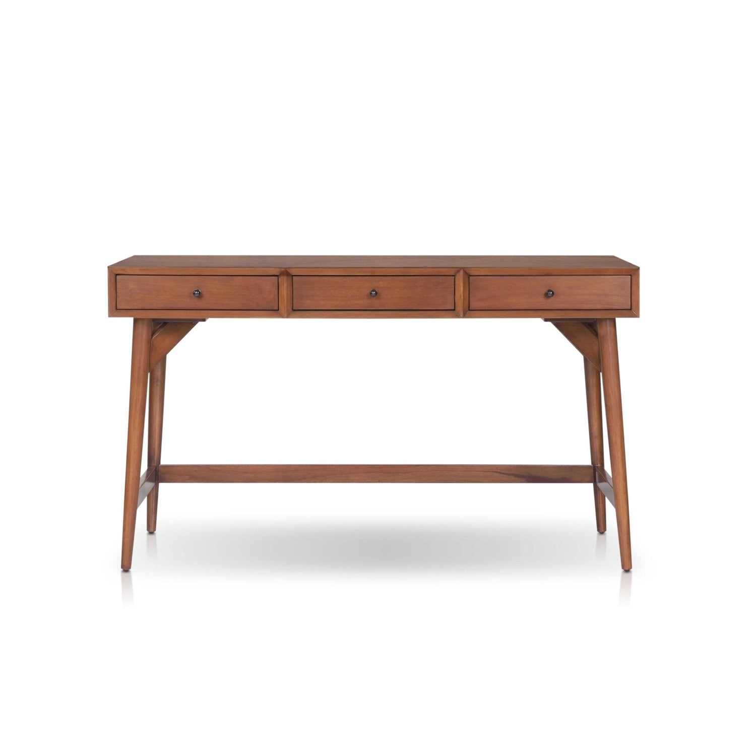 Upgrade your workspace with the Flynn Large Desk, crafted in a timeless Chestnut finish. This desk features ball-bearing metal drawer glides and English dovetail construction for reliable use. With three spacious, felt-lined drawers, it offers ample storage for all your office essentials. The desk comes with light assembly of the legs and support bars, ensuring an easy setup.