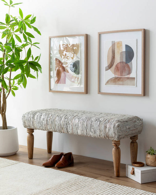 The Angolemi Silver Bench combines artisan techniques with a modern aesthetic. Its turned wooden legs provide a classic foundation, while the subtly textured leather seat adds depth and dimension. The silver color palette complements a variety of interiors, from minimalist modern to rustic-chic.