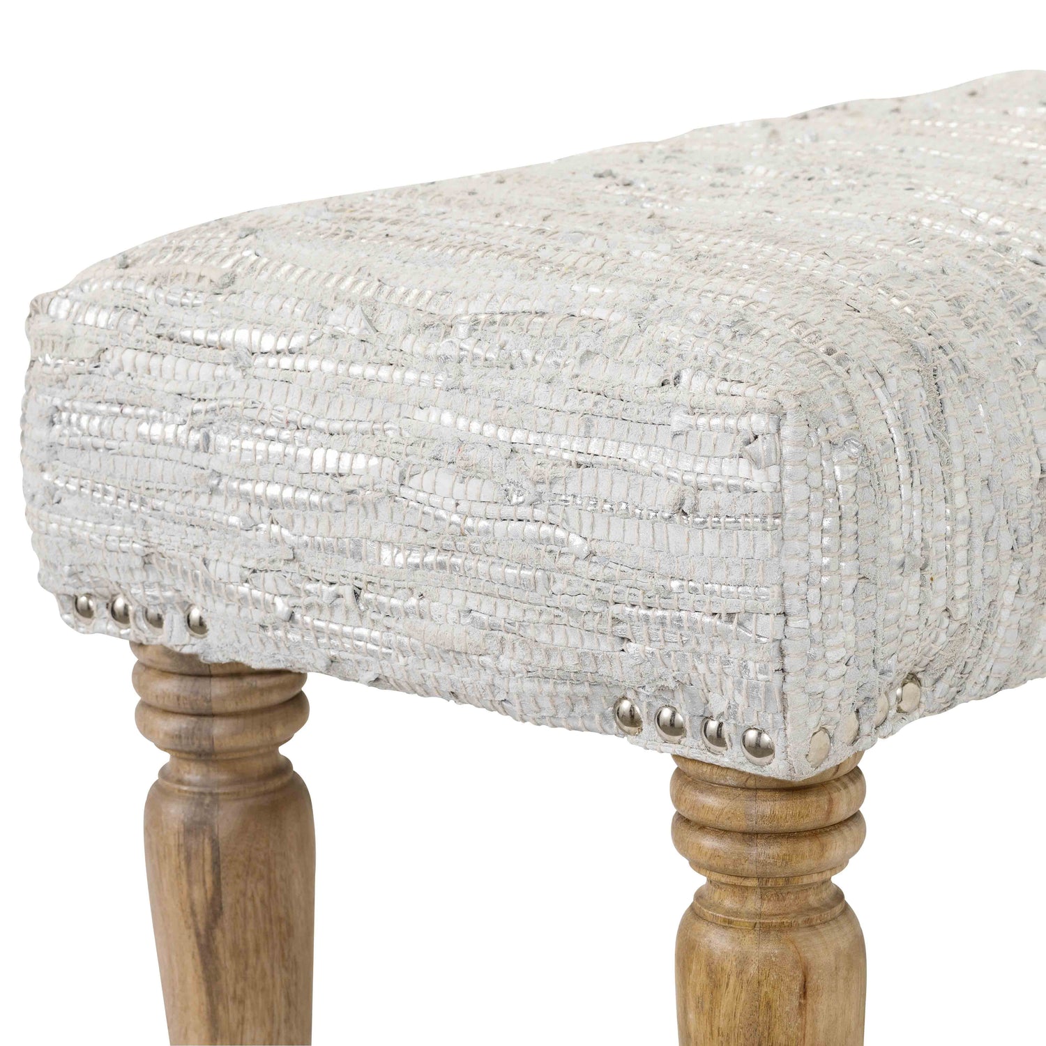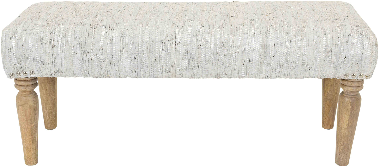 Introduce a touch of modern sophistication to your interior with the Angolemi Silver Bench. Expertly crafted in India, this bench brings together the luxurious texture of leather, the strength of manufactured and solid wood, and a beautifully hand-finished silver hue to deliver an eye-catching yet versatile design. Whether placed at the end of your bed, in a hallway, or as additional seating in the living room, the Angolemi Bench enhances your space with stylish functionality and artisan charm.