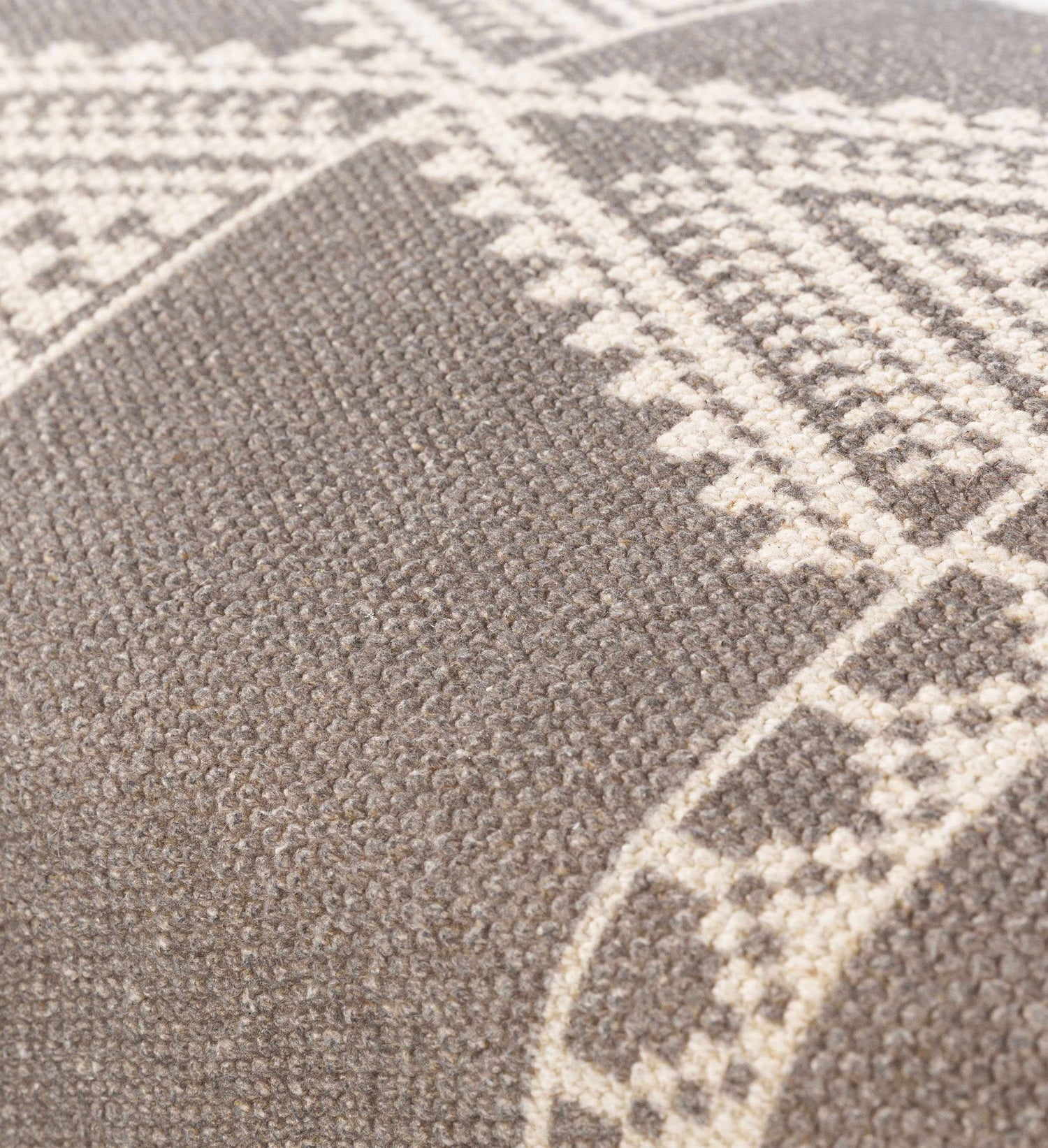 What sets the Gaschurn Bench apart is its thoughtful blend of influences. The cushioned top showcases a detailed, tribal-inspired motif handwoven by skilled artisans in India. Beige embroidery set against a warm gray base brings an artisanal character to this otherwise minimalist form.