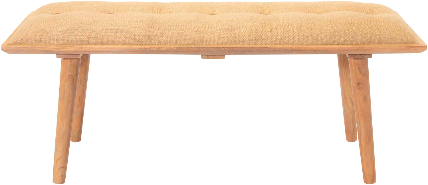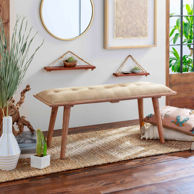 Introduce timeless elegance and earthy texture into your space with the Vis Khaki Bench. Crafted in India with a blend of faux leather, natural jute, and solid wood accents, this modern upholstered bench brings both comfort and charm to your home. Its khaki-toned cushion sits gracefully atop a warm brown manufactured wood frame, delivering a stylish and cozy seating option for entryways, bedrooms, or living rooms. Designed to balance organic beauty and modern simplicity, this bench is the perfect accent piece for lovers of clean lines and natural textures.
