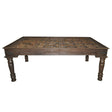 Antique Teak wood door from late 1800s has been thoughtfully repurposed to craft this unique Dining table. The maple flower indentation on the door gives a transitional look to the table making it apt for an eclectic style home. The aged distressed door is framed in solid wood cornice detail.