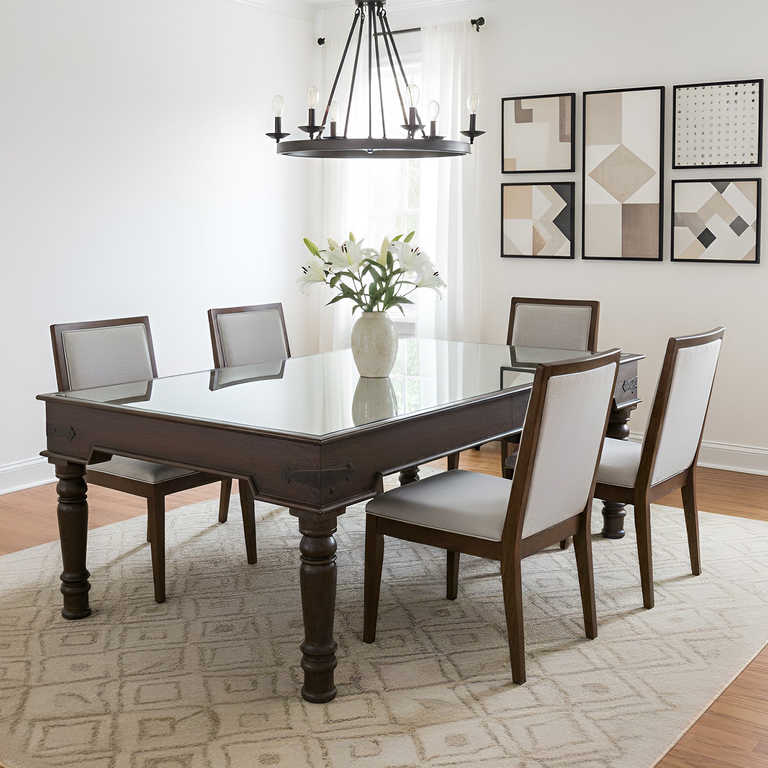 1900s Teak wood door cladded with brass foil has been thoughtfully repurposed to craft this unique Dining Table. The geometric squares are bordered by brass spikes giving this table a transitional look. It features the original brass latch adding to the authenticity of this eclectic Dining table. The elegant door is framed in solid wood and is held firmly by hand carved decorative legs.