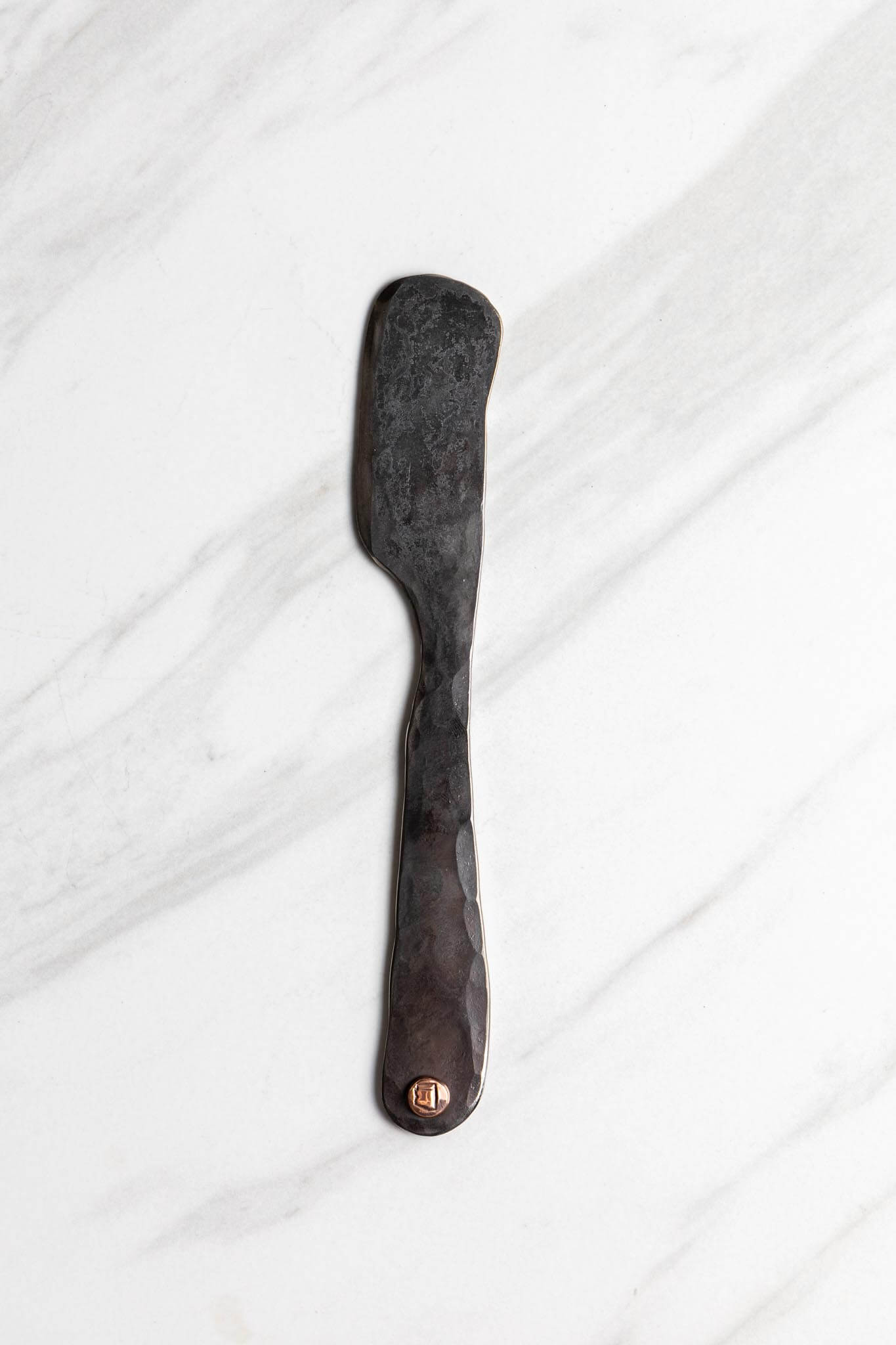 This elegant hand forged stainless-steel knife is the perfect companion to a charcuterie board. Ideal for all types of cheeses and butter. Features beautiful forged texturing and a copper touchmark.