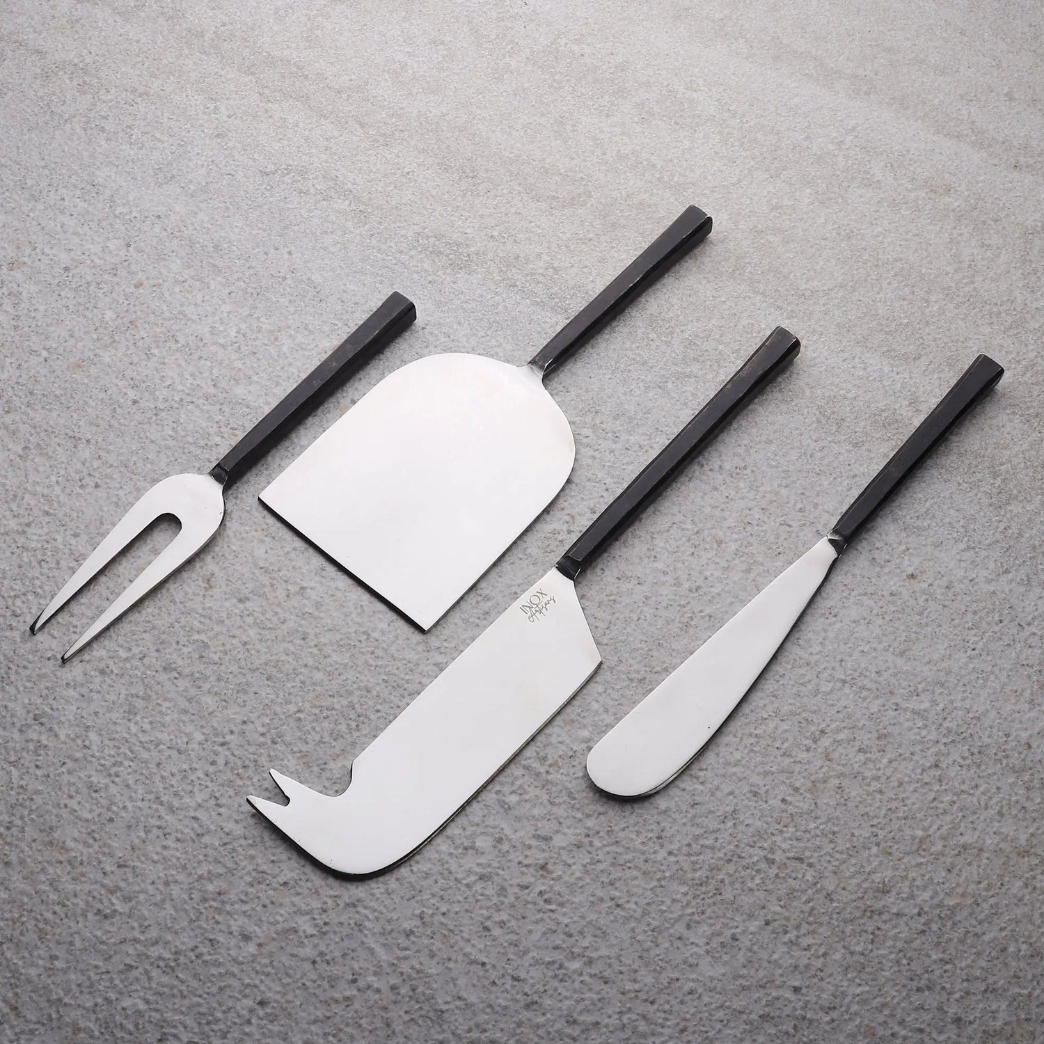 Our Jason Black Cheese Knives 4 Pc. Set showcases sleek square black handles contrasted by mirror-polished utensils. Ideal for cheese enthusiasts and for those who love to entertain from home, these artisan-crafted cheese knives will elevate your cheese and charcuterie platters.