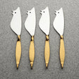 The Twisted Urban Vintage Gold Ratoncito Cheese Spreader/Knife Set features mouse-shaped cheese spreaders with pointed snouts and ears, perfect for spearing cheese cubes, pickles, and olives. Showcasing polished stainless steel knives and contrasting hammered gold "tails", these small cheese spreader knives will have a big impact on your charcuterie boards.