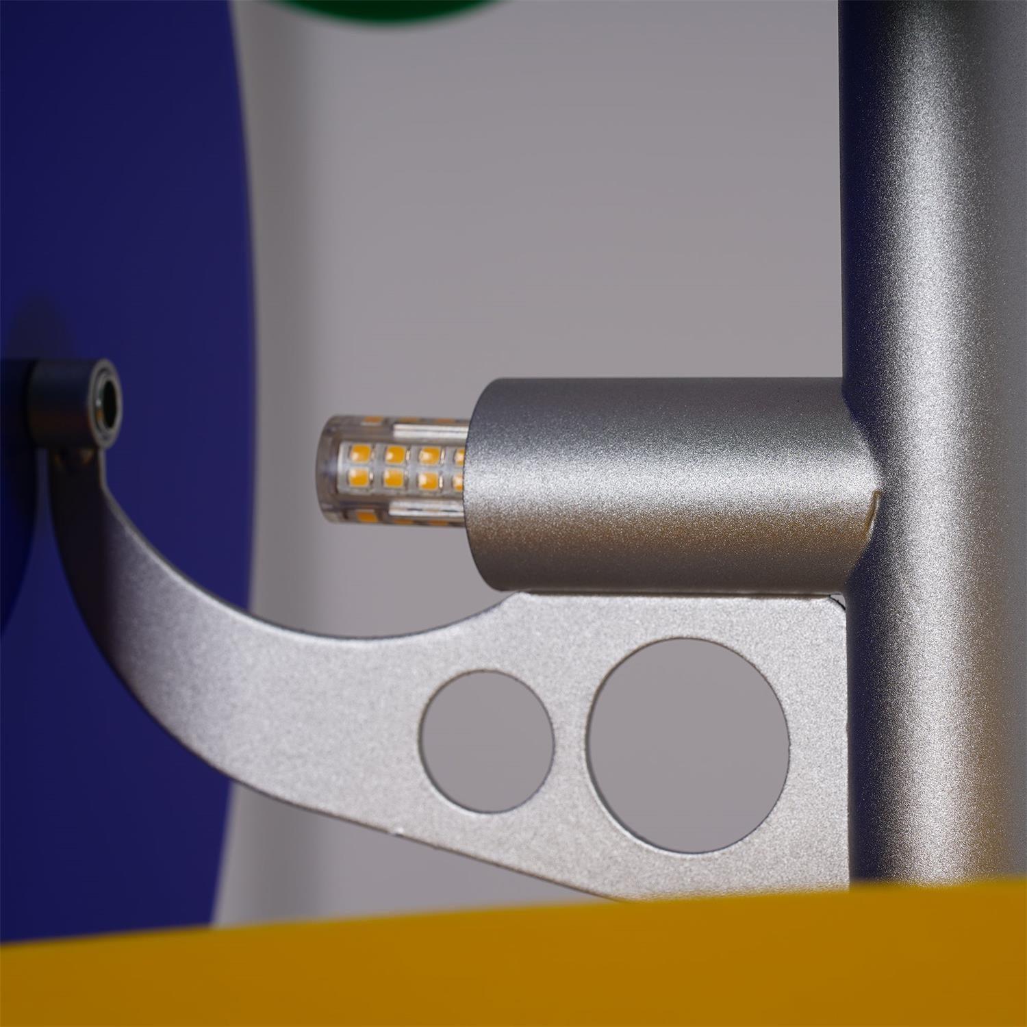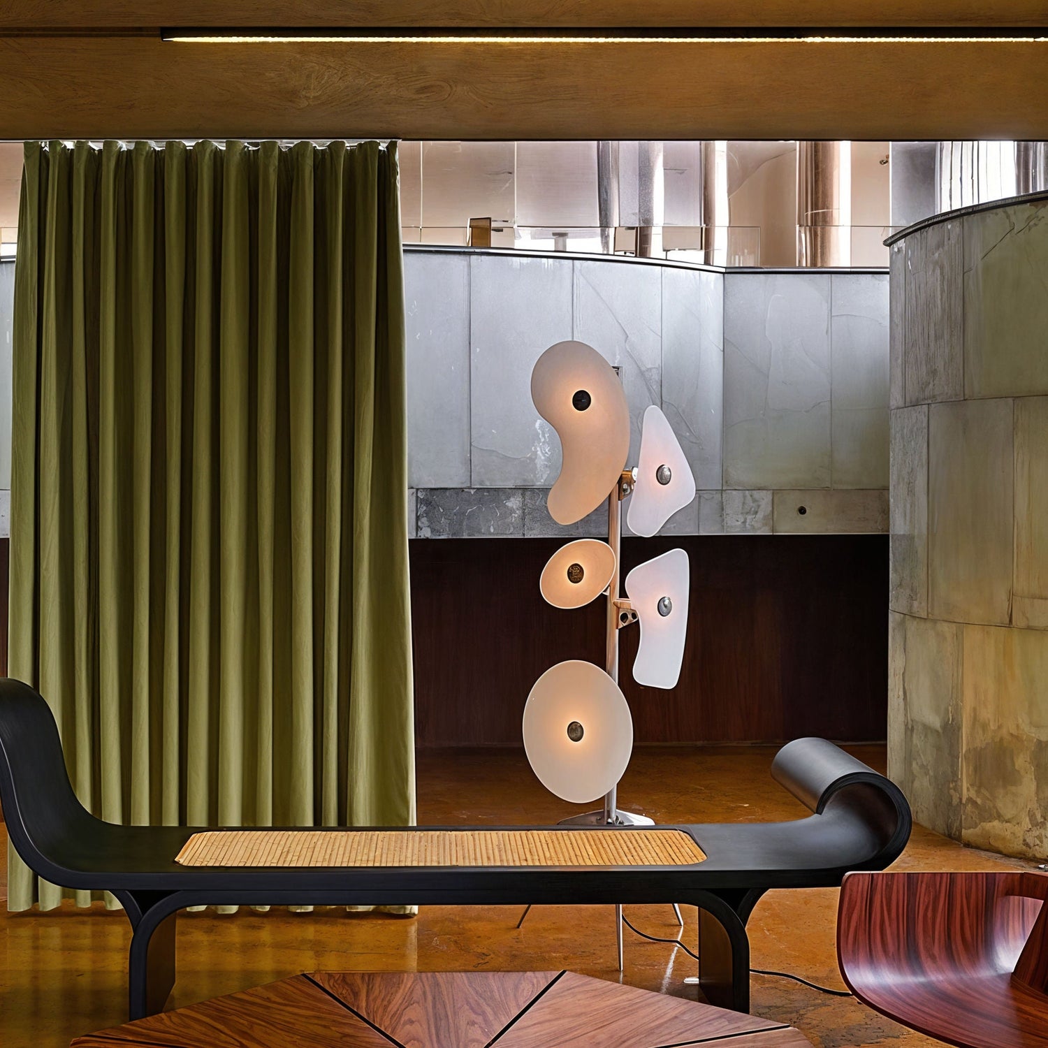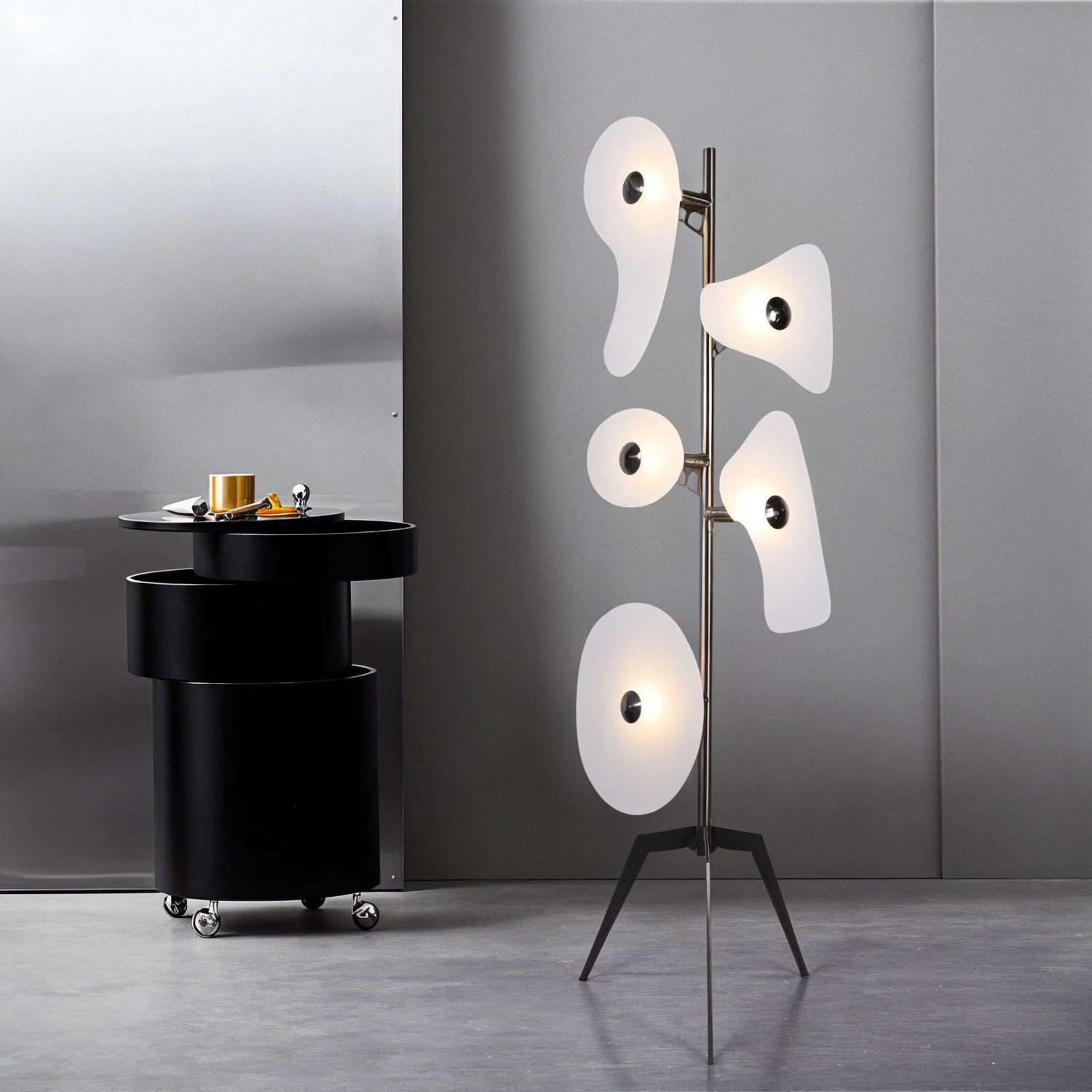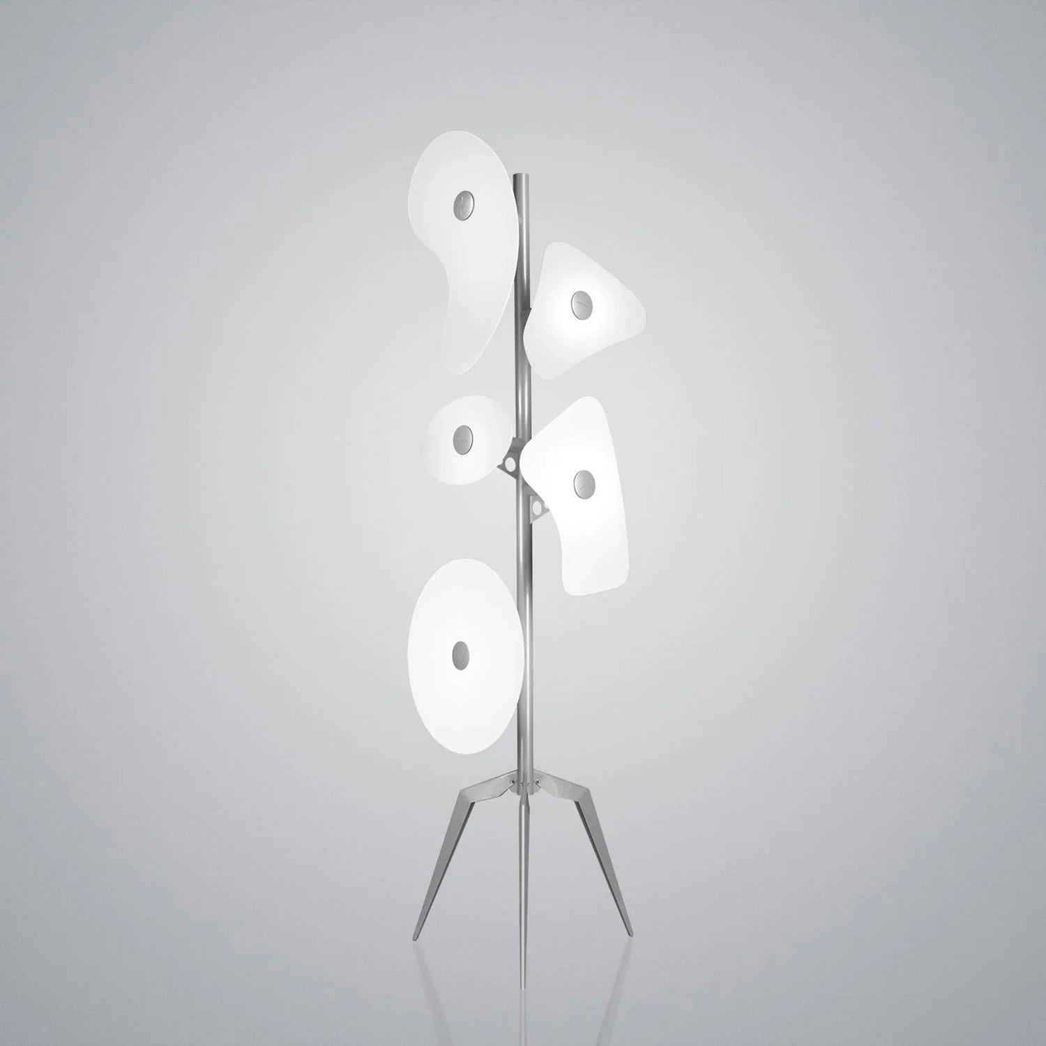 Embrace the striking allure of our sculptural masterpiece—an iconic symbol of lighting innovation. Crafted from laser-cut metal and lacquered rods, its dynamic structure comprises a movable tripod supporting five arms adorned with serigraphic acrylic diffusers. Each uniquely shaped slab contributes to a bold graphic motif, accentuated in the white variant. Switched off, the colored diffusers evoke surrealistic art; when illuminated, they mesmerizingly mosaic light. Satin-finished exteriors lend tactile richness, while glossy interiors exude luminosity, creating an enchanting illusion.