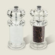 The 505 Salt & Pepper Mills feature a timeless clear acrylic design that showcases the contents while seamlessly blending with any kitchen or dining décor. The mills stand at an ideal height for comfortable use and are equipped with high-quality grinding mechanisms—carbon steel for pepper and sharp ceramic for salt. These durable mills allow for smooth and effortless seasoning with adjustable settings, making them a versatile addition to both home kitchens and professional settings.