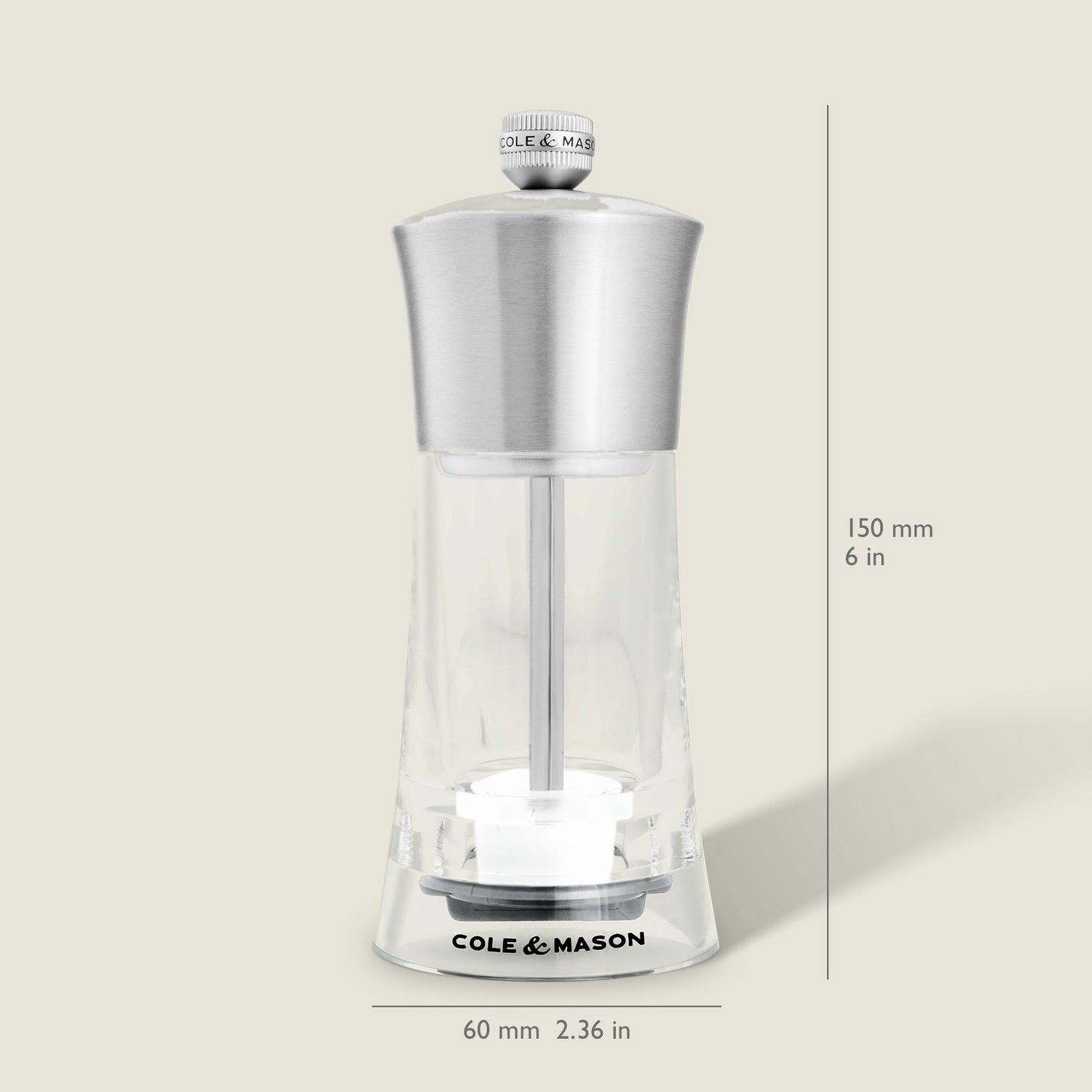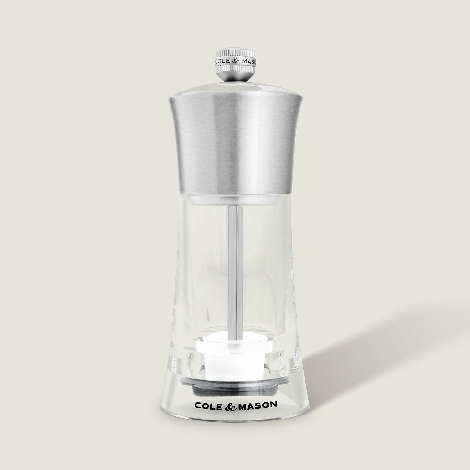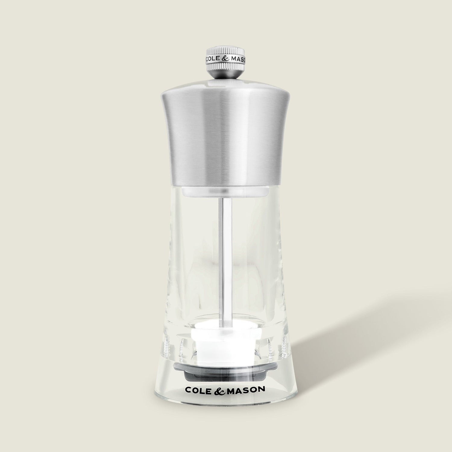 The Bromley Acrylic Salt & Pepper Mills feature a stylish combination of clear acrylic and stainless steel, offering a contemporary look with high functionality. The transparent acrylic body allows for easy visibility of contents, while the stainless steel accents provide a sleek and modern touch. These mills feature a durable grinding mechanism that offers smooth, adjustable seasoning, allowing users to switch between fine and coarse grinds effortlessly. A perfect blend of style and practicality, they are ideal for both casual dining and elegant table settings.