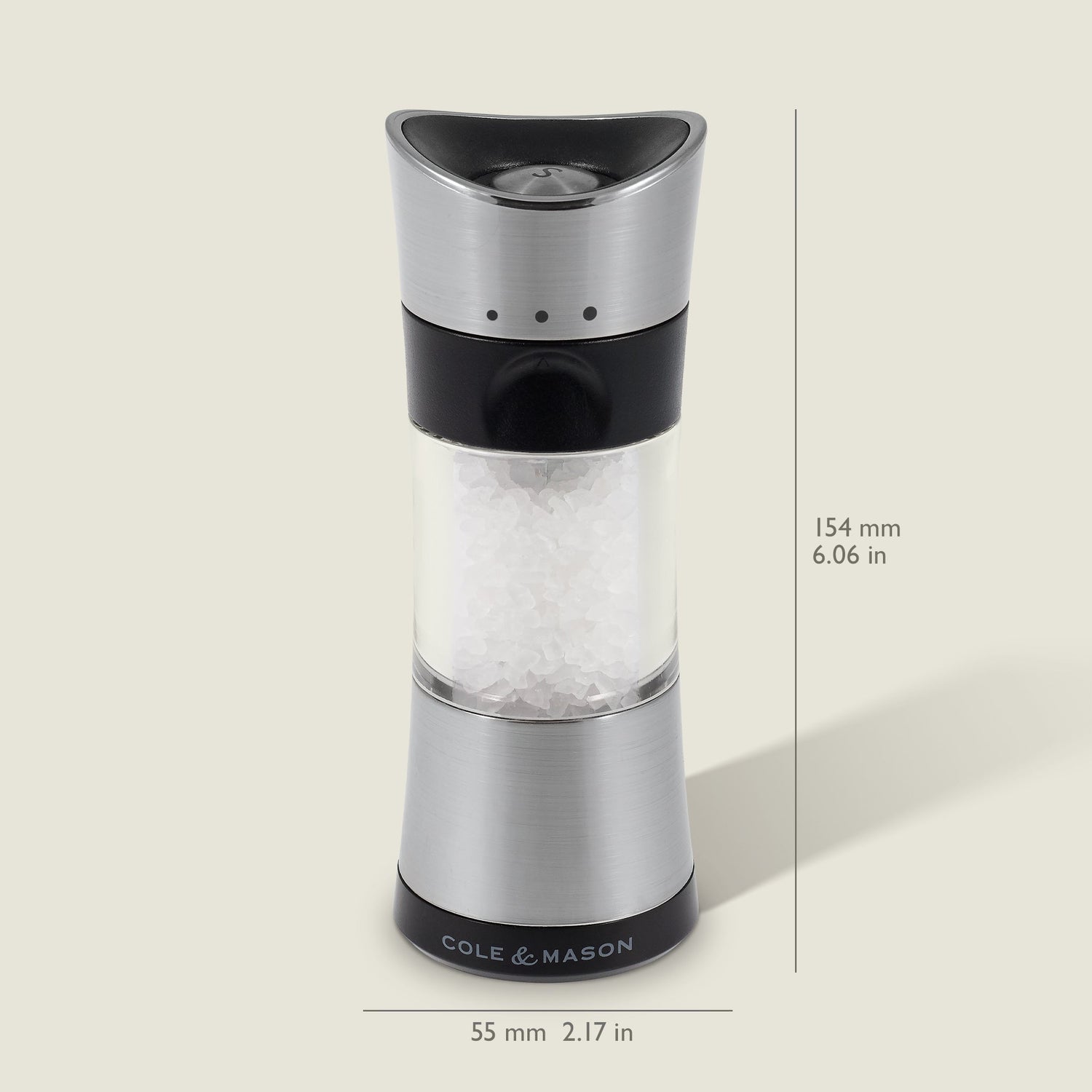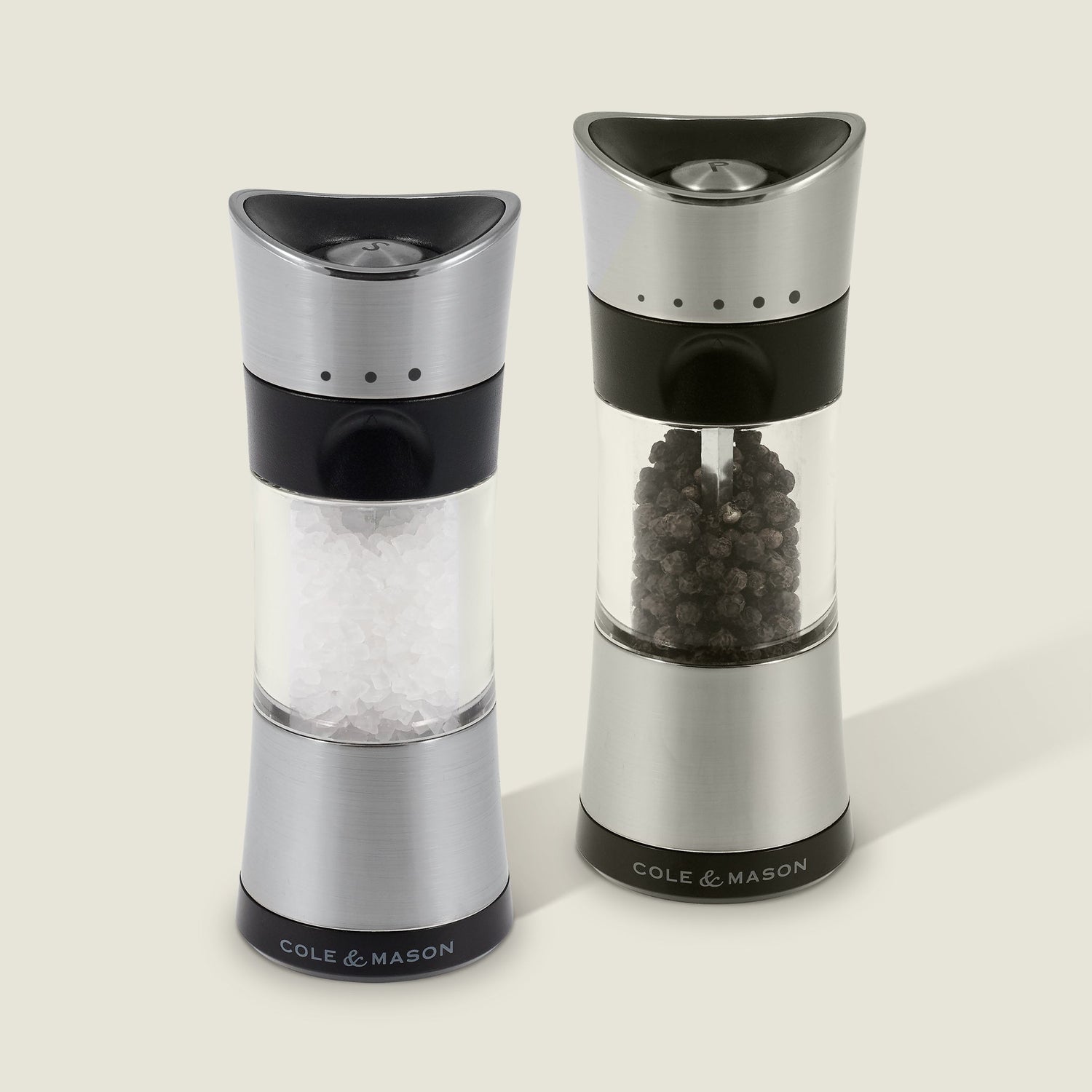 The Cole & Mason 6 inch Horsham Salt and Pepper Mills do more than accent the kitchen; the inverted grinder keeps countertops and tables clean, too. These sleek 6-inch chrome mills feature our top-of-the-line Gourmet Precision millworks to ensure perfect, smooth grinds every time for a lifetime. The pepper mill uses premium hardened steel in a special design to slice and grind at the same time for maximum flavor. Five preset grinds provide grind control in a snap, from fine powders to delicious gourmet grains. The salt mill uses diamond-cut ceramics for a lifetime of grinding even the toughest artisan sea salts at any size. Three preset grinds provide grind control in a snap, from fine grains to chunky gourmet flavor. If you’re looking for a modern and stylish gift for Christmas, birthdays, weddings or housewarmings, the Horsham mills will thrill with style!