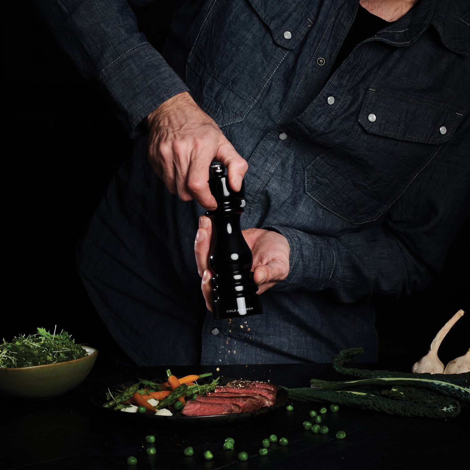 Pepper mills are fitted with a design registered Precision+ carbon steel mechanism, that strips peppercorns instead of crushing them, ensuring maximum flavor release from every turn.