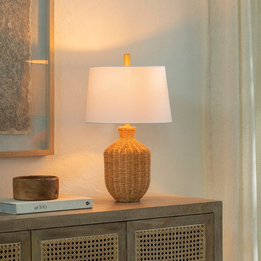 • Material: Body: Rattan; Shade (Outside): Linen; Shade (Inside): Polyester; Finial: Metal