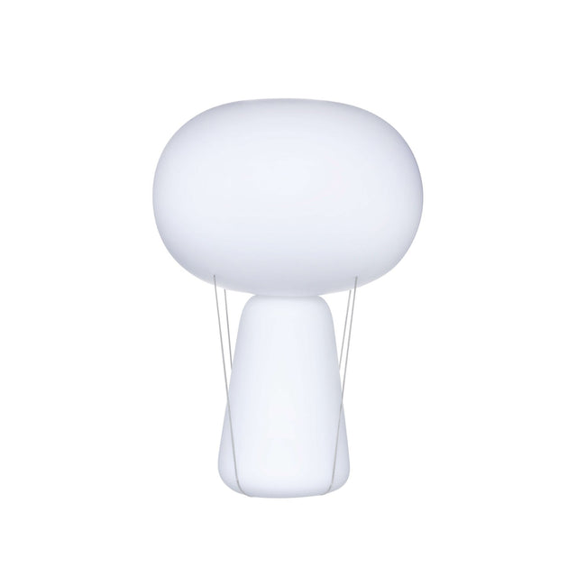 Inspired by the floating silhouette of a hot air balloon, this NUDE Blow lamp by Tomas Kral presents a soft, essential silhouette crafted from lead-free crystal. The solid base is crowned with a milky white shade — the two components connected using simple rubber bands for a conceptual, barely-there finish.