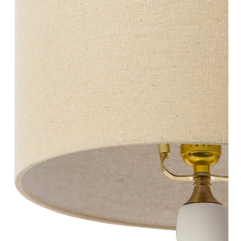 - Colors: Body: White; Shade (Outside): Beige; Shade (Inside): White; Finial: Metallic - Brass; Harp: Metallic - Brass; Cord: Translucent