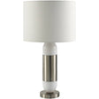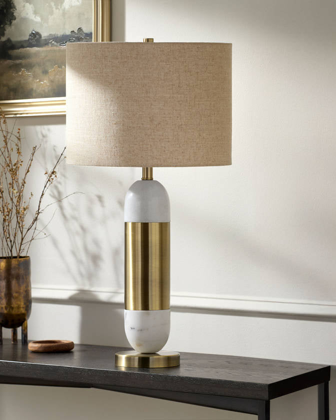 Indulge in luxury with the Monte accent table lamp. This chic lighting piece boasts a 29-inch tall body made of exquisite marble and iron, lending your space an air of opulence. The Iron base ensures stability while the linen exterior and polyester interior of the shade emit a soft, warm glow when lit. Not only is it a feast for the eyes but also easy to maintain ? just wipe clean with a dry cloth and avoid harsh cleaners to keep its finish pristine. Whether you're looking to elevate your room's decor or simply want a tasteful lighting solution, this stunning table lamp is sure to impress.