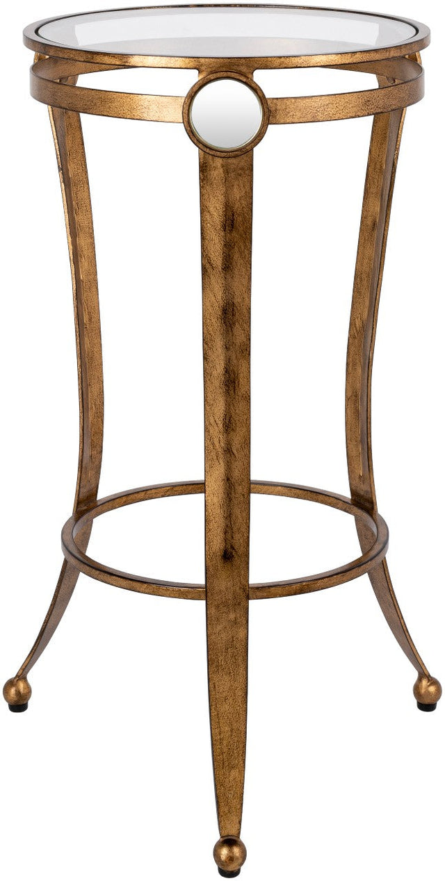 The Antiesenhofen Gold End Table showcases a clear glass tabletop that creates an airy, open look; perfect for keeping your space light and uncluttered. The transparent surface rests atop a gracefully curved gold-finished metal frame, enhanced with a circular decorative accent just beneath the rim for added charm. Its slender legs and delicate detailing add a touch of glamour without overwhelming your décor, making it a perfect accent piece for any room.