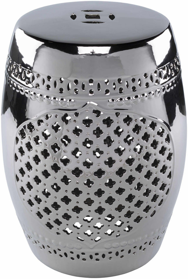 Inspired by traditional global motifs, the pierced detailing isnt just decorativeit adds depth, texture, and a touch of artistry. The stools gleaming silver finish reflects light beautifully, making it ideal for brightening up shady corners or creating contrast in neutral-toned outdoor settings. It's a global garden accent that brings worldly charm and contemporary edge together in one piece.