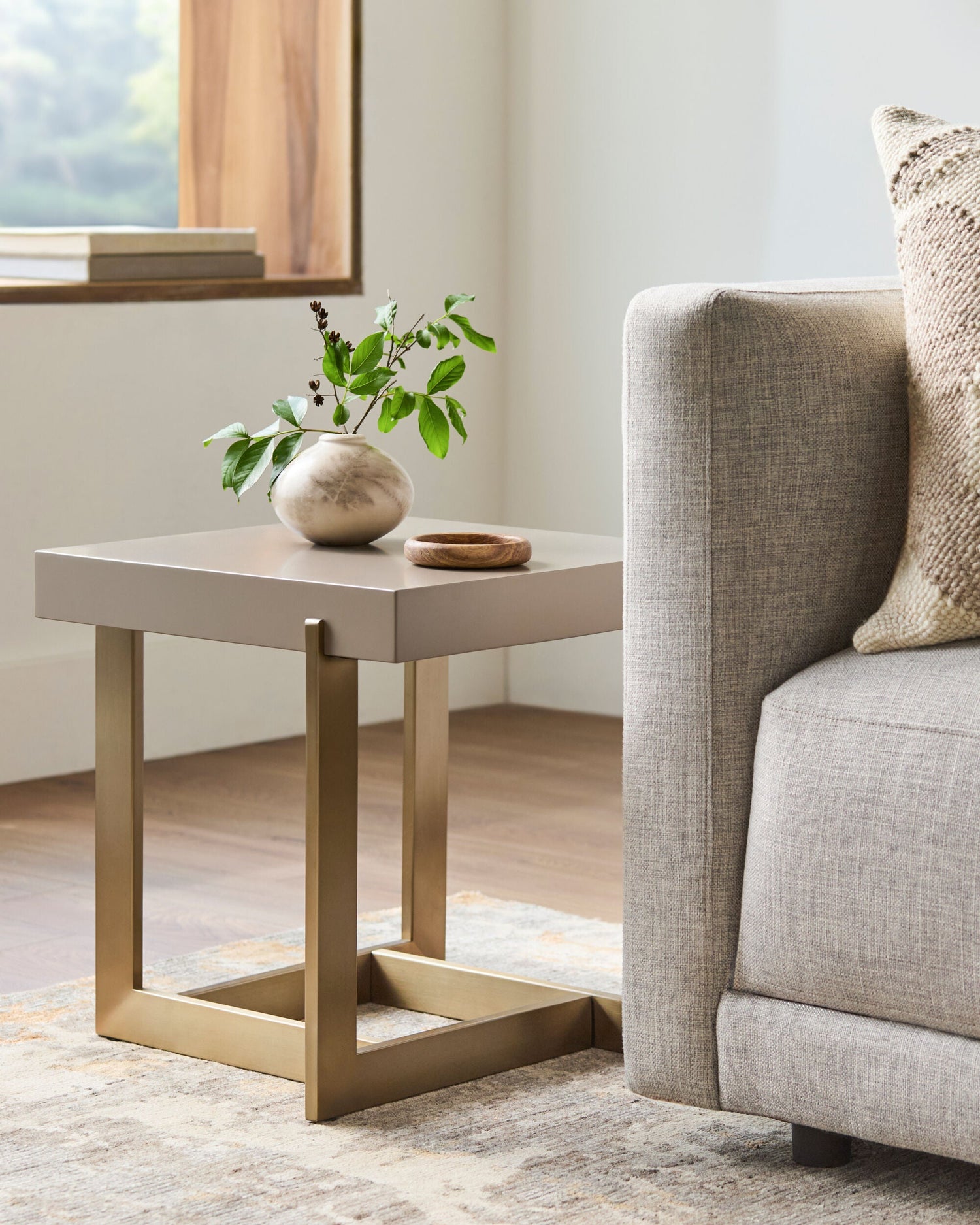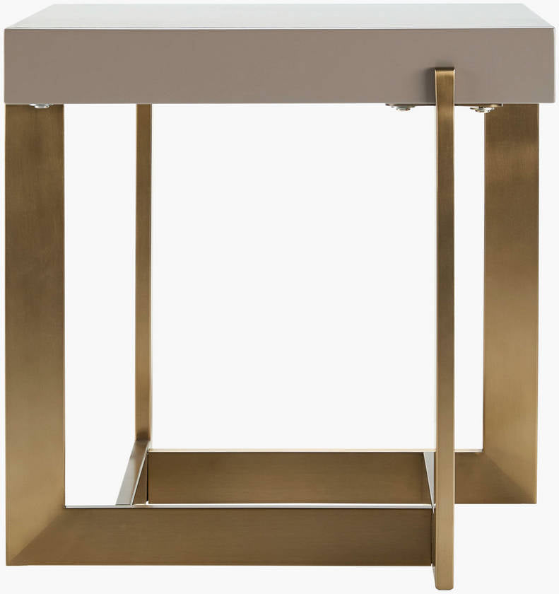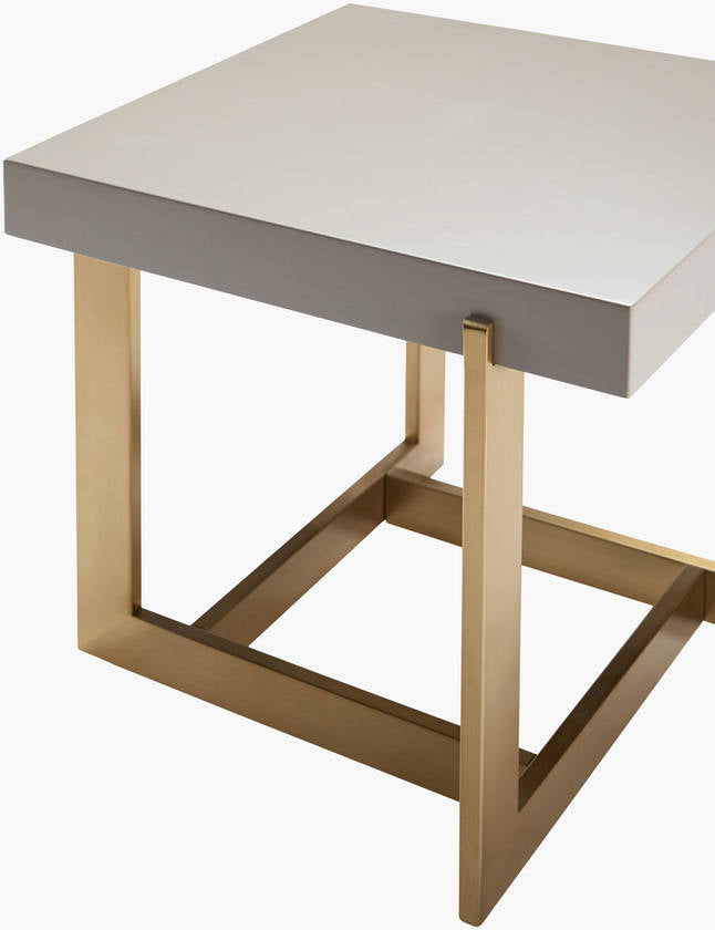 Add a sculptural statement to your space with the Destry Gray End Table, where geometric precision meets sleek sophistication. This compact yet impactful piece features a clean-lined gray tabletop crafted from premium manufactured wood, beautifully contrasted by a bronze-finished stainless steel base that adds a hint of metallic warmth. With its bold square form and architectural base, the Destry end table is a masterclass in modern elegance.