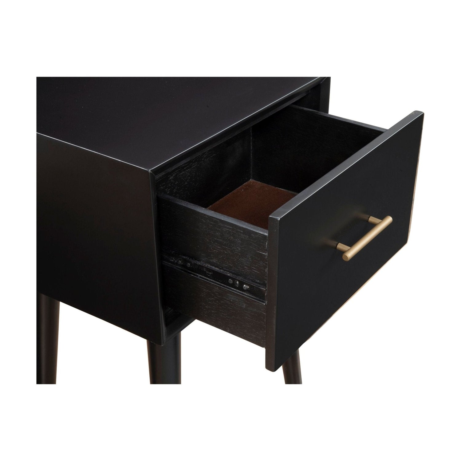 Lean over and grab your book or remote from the convenience of your sofa with the Flynn end table. Brimming with Mid-Century modern appeal, this piece is designed from Mahogany wood solids and Okume veneer and features clean-lines that work perfectly with contemporary spaces. Sleek, tapered legs add an understated look, while a spacious surface top is ideal for a stylish lamp or table clock. The storage drawer is felt lined. Available in a timeless black finish. Mix and match with other pieces from the Alpine Furniture Flynn collection.