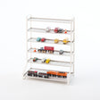 The new hot spot for toy cars and trains. Six decks of parking and storage for toy cars, trucks, and trains. This toy garage doubles as a play area and a storage organizer. First, kids can wheel, drive, park, flip, and race their mini-mobiles. When it’s time to tidy each toy car has its own special parking spot, making clean-up easier and more enjoyable. For toy train enthusiasts, flip the tiers and use the side with the tracks. You can flip all the tiers, or just a few, depending on what your collection looks like!