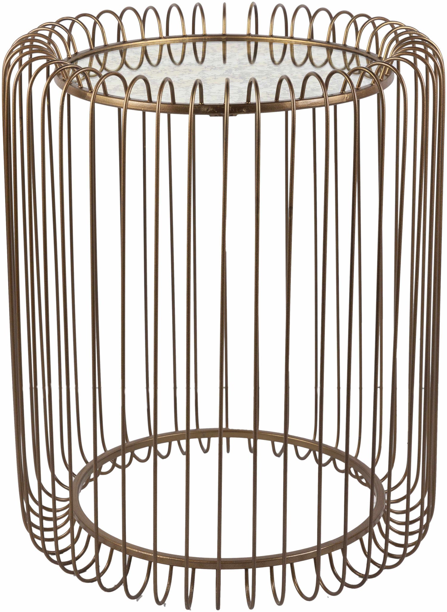 The Lobmingtal Gold End Table stands out with its airy yet sculptural silhouette. The open metalwork design is hand-formed into a cylindrical frame that plays with vertical lines, creating a visual rhythm thats both delicate and bold. Topped with a sleek mirror, it reflects natural light, enhancing the sense of space and brightness in your room.
